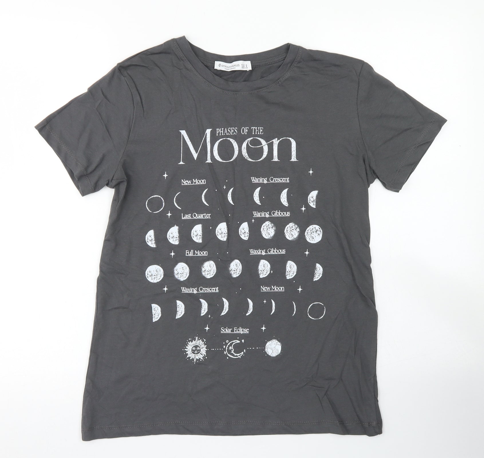 Womens Grey Cotton Basic T-Shirt Size S Crew Neck - Phases Of The Moon