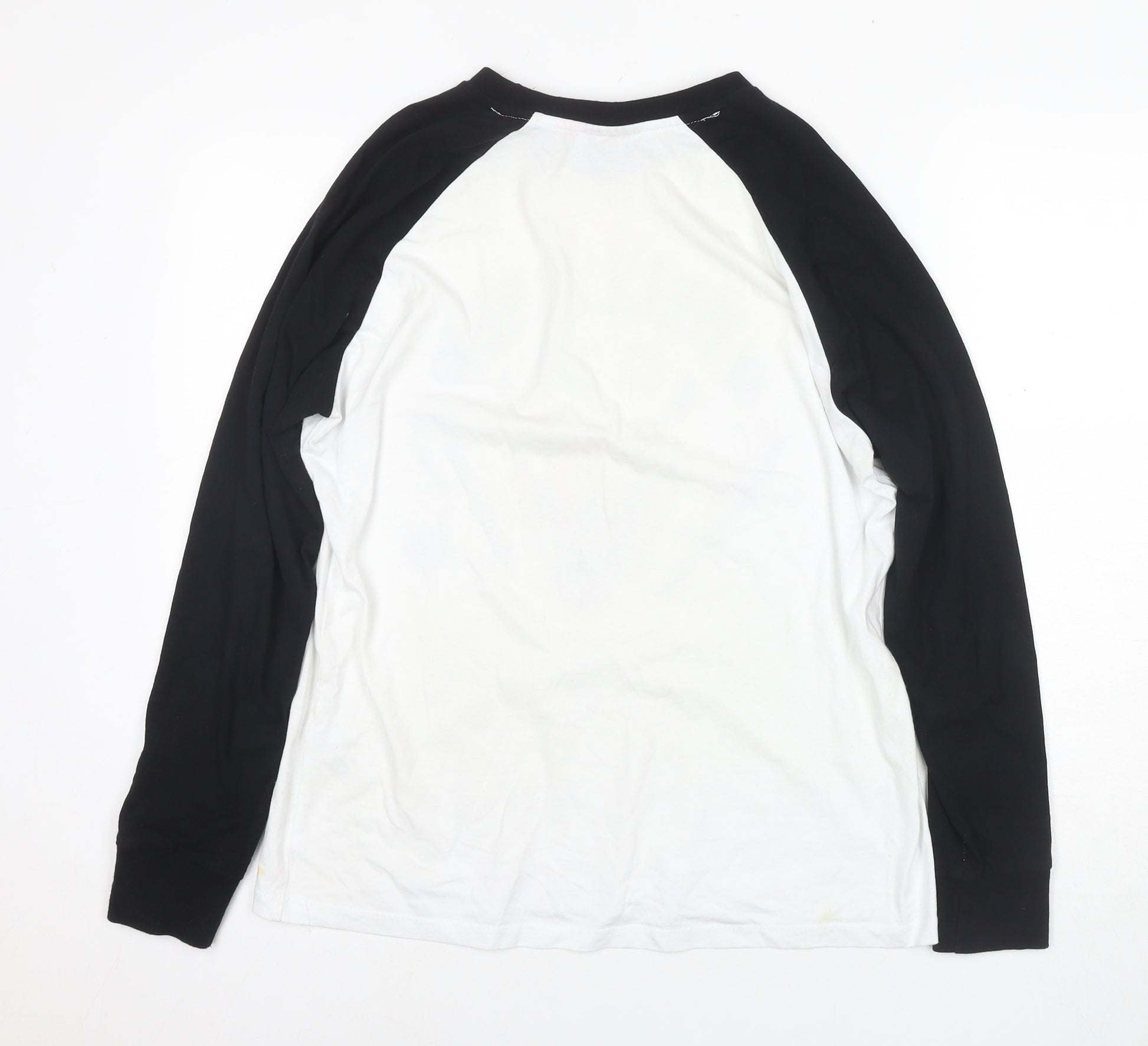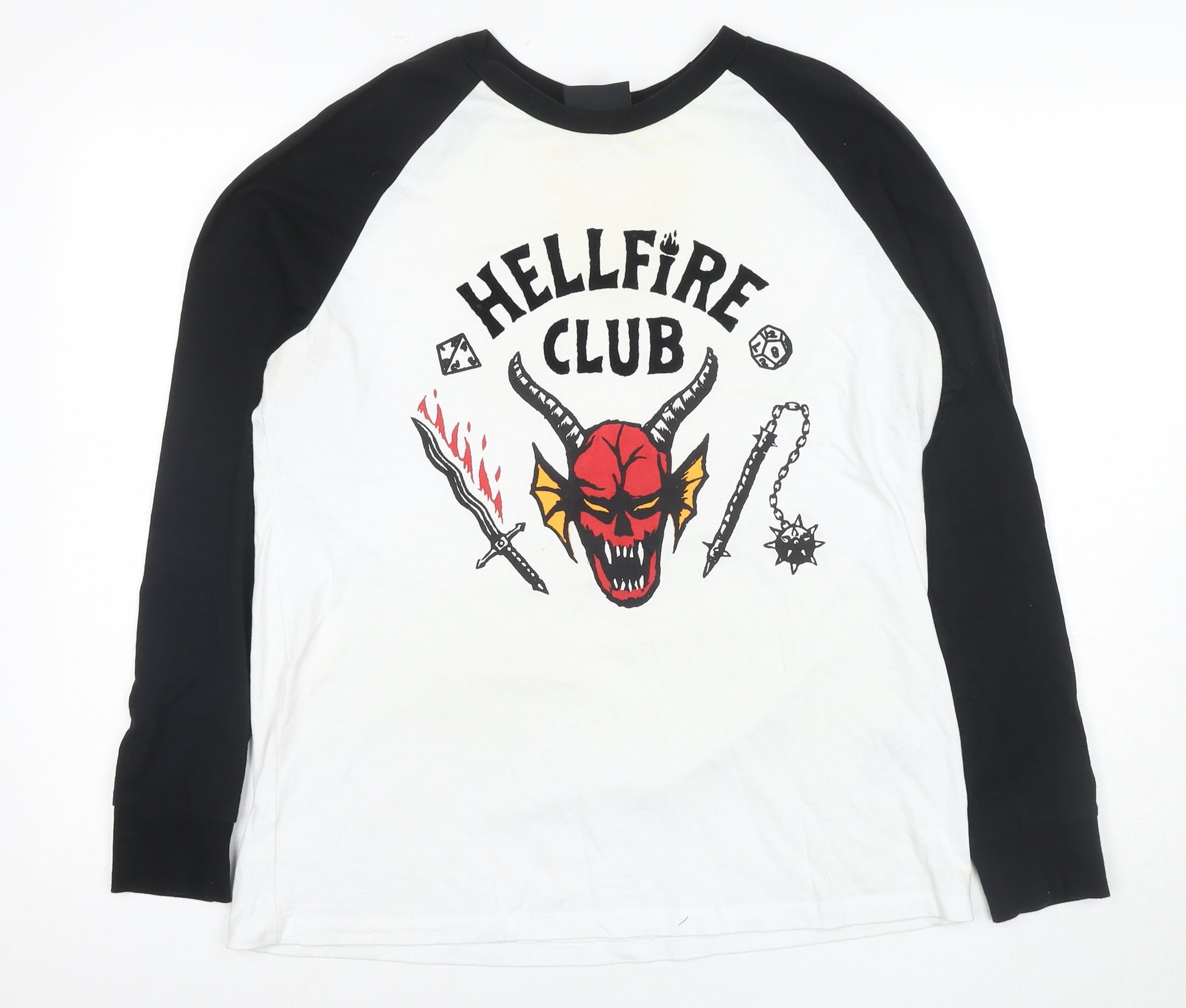 Embrace the nostalgia with this Stranger Things 'Hellfire Club' T-shirt, perfect for fans and collectors alike. Crafted from comfortable 100% cotton, this long sleeve top features a striking graphic print of the iconic 'Hellfire Club' emblem set against a crisp white and black backdrop. The classic raglan sleeve design offers a relaxed fit, ensuring it’s suitable for a range of activities and occasions, whether you're lounging at home or out with friends. The jersey fabric and crew neck provide a soft feel and easy wearability, making it a versatile piece for both spring and autumn. While the shirt is in excellent condition, there are slight signs of wear on the fabric, adding to its vintage-inspired charm. Ideal for casual outings, this officially licensed merchandise celebrates retro TV style and is machine washable for hassle-free care. Add a retro touch to your wardrobe and let your style join 'The Upside Down'!