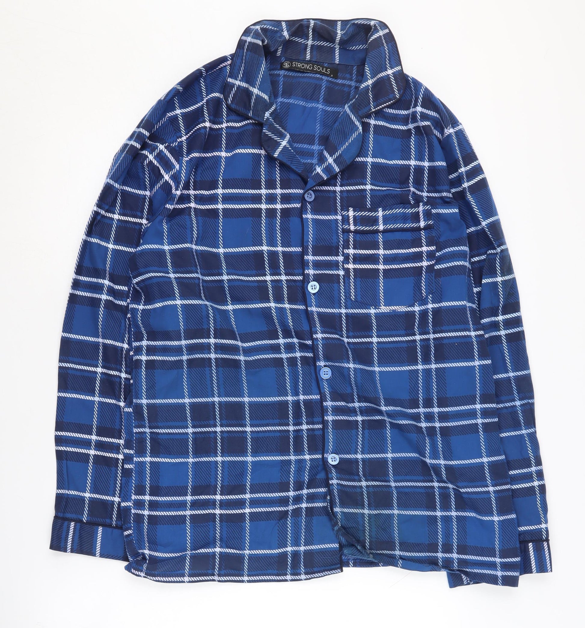 Experience the blend of comfort and style with the Strong Souls Men's Blue Plaid Pyjama Top. Crafted from a mix of durable polyester and soft cotton, this top promises a restful night's sleep or a relaxed lounging experience. The plaid pattern in shades of blue adds a classic yet contemporary touch, perfect for those cool autumn and winter nights. Designed with a collared neckline and long sleeves, it ensures warmth and a snug fit. The button closure adds a hint of traditional charm and convenience. Sized regular for a comfortable fit, this pyjama top is machine washable, making it a practical choice for everyday wear. Although pre-owned, it remains in excellent condition, free from any visible damage or wear. This Strong Souls piece is ideal for those looking to add a versatile nightwear staple to their wardrobe. Whether you're winding down after a long day or enjoying a lazy weekend morning, this pyjama top is sure to keep you feeling cosy and stylish.