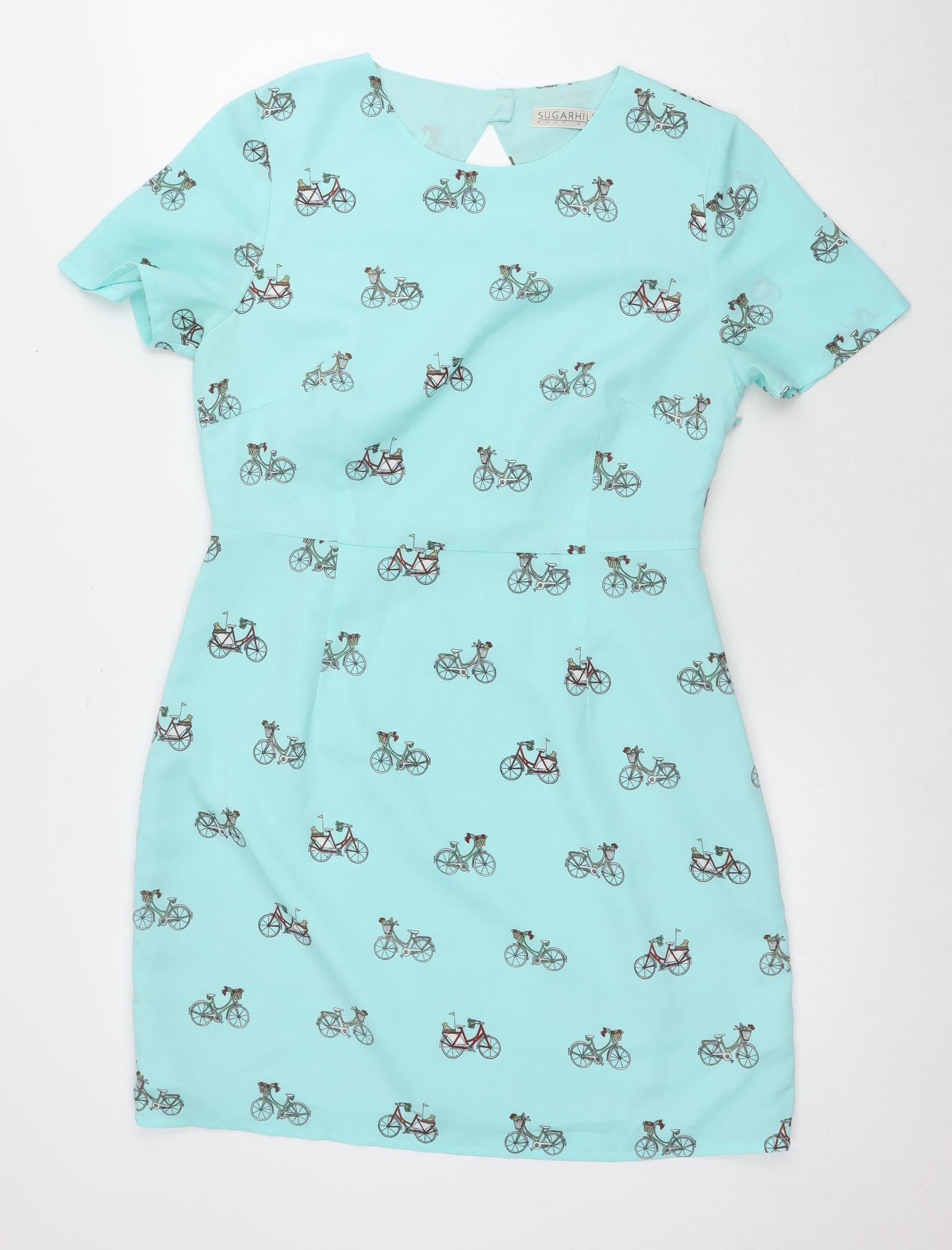 Discover a playful blend of style and whimsy with this Sugarhill Boutique Women's Shift Dress. Featuring a refreshing blue hue adorned with a unique bicycle print, this dress adds a fun touch to your casual wardrobe. Crafted from 100% polyester, it offers a lightweight and comfortable fit perfect for spring and summer outings. Designed with a crew neck and short sleeves, it captures a chic yet relaxed aesthetic. Whether you're cycling through the city or meeting friends for brunch, this versatile piece promises to keep you looking effortlessly stylish. The concealed zip closure ensures easy wear, while the regular size 14 fit makes it a flattering choice for a variety of body shapes. Pair it with your favorite sneakers or sandals to complete a trendy look. Despite a slight stain on the front hem, this dress remains in very good condition, promising quality with a dash of charm. Priced keenly at £22.75, it's an irresistible addition to your seasonal wardrobe. Ideal for women who embrace both comfort and creativity, this dress is the perfect choice for any casual occasion.