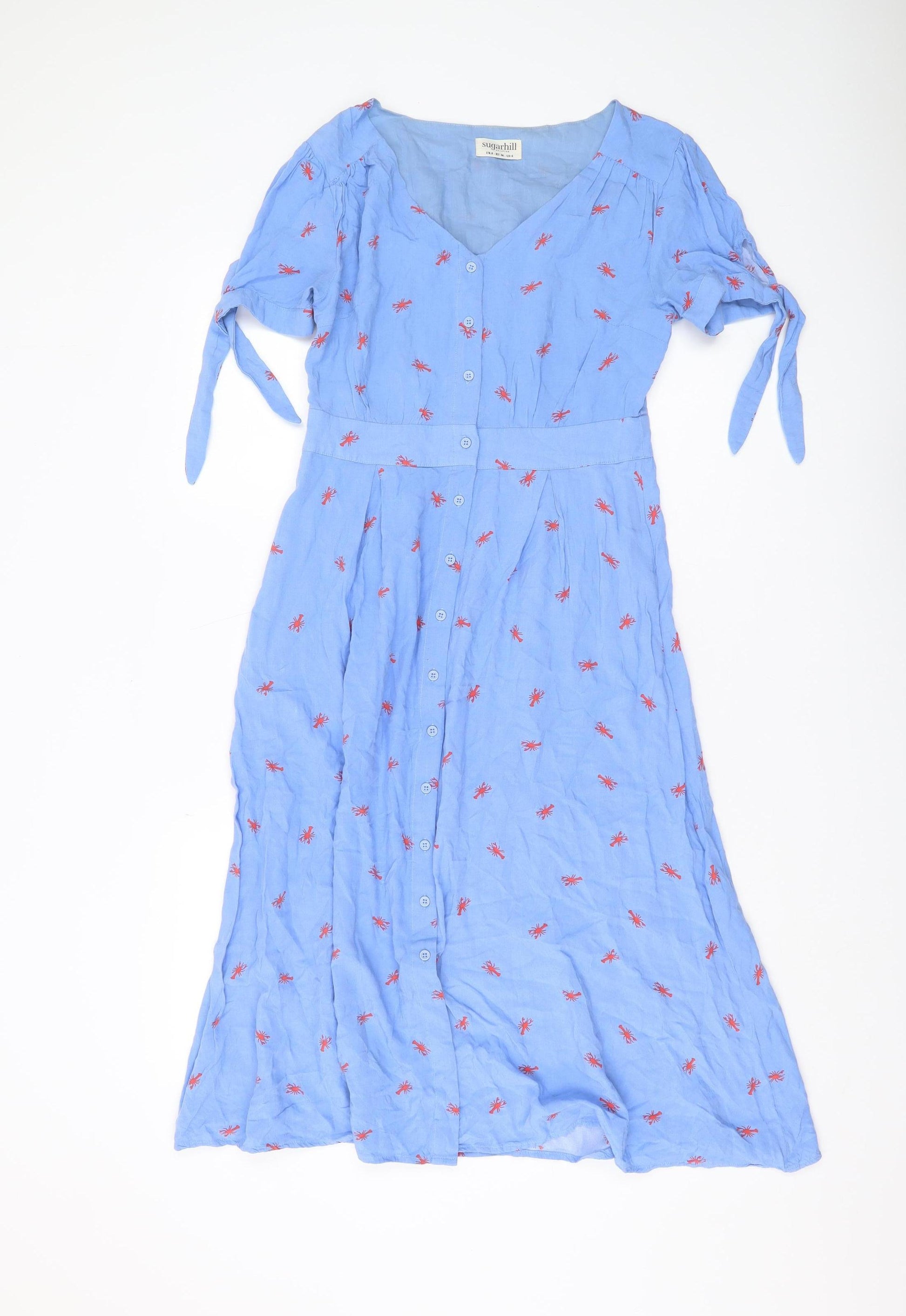Discover a charming addition to your wardrobe with this Sugarhill Brighton Women's Blue Midi Shirt Dress, perfect for spring and summer. Crafted from 100% viscose, this dress provides a soft, breathable feel, ideal for casual beach outings or a leisurely stroll in the park. The adorable animal print pattern adds a touch of fun, while the flutter sleeves and V-neckline enhance its elegant appeal. Designed in a regular size UK 8, the dress is finished with button closure for a classic shirt dress look. The lightweight, woven fabric ensures you stay comfortable and stylish, complemented by embroidered accents for an extra dash of detail. Whether you're enjoying a sunny day at the beach or a casual brunch, this dress keeps you fashion-forward. Embrace versatility and charm with this effortless piece, maching washable for easy care. Excellent condition, though showing light wrinkles, offering a second-hand treasure that's both stylish and practical. Don't miss out on this delightful dress, perfect for adding a splash of personality to your casual ensemble.