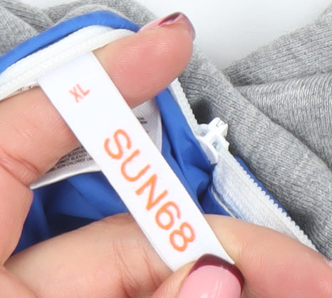 Upgrade your outerwear with this stylish SUN68 men's blue hooded windbreaker jacket in size XL. Designed for both comfort and practicality, this mid-length jacket features a lightweight polyamide outer shell that provides durability and flexibility, making it ideal for everyday wear or travel. The contrasting grey cotton lining offers additional comfort and breathability, ensuring a cosy feel during transitional seasons like spring and autumn.The jacket has a sleek modern silhouette with a full front zip fastening, two zipped side pockets for secure storage, and elasticated cuffs and hem for a snug fit. The adjustable drawstring hood enhances its versatility, providing protection against light wind and rain. Completed with a subtle SUN68 logo on the chest, this jacket combines understated design with functional features to suit a range of casual occasions. Perfect for layering over tees or sweatshirts, it is ideal for walking, commuting, or weekend leisurewear.As a testament to SUN68’s contemporary Italian design, this jacket balances sporty aesthetics with everyday practicality, making it a wardrobe essential for men who appreciate both style and comfort. With its lightweight construction and fully machine-washable design, it’s easy to care for and ideal for those on the go. In excellent pre-owned condition with very light wear, this blue windbreaker represents great value for anyone looking to elevate their casual outerwear collection with a piece that’s both versatile and effortlessly stylish.