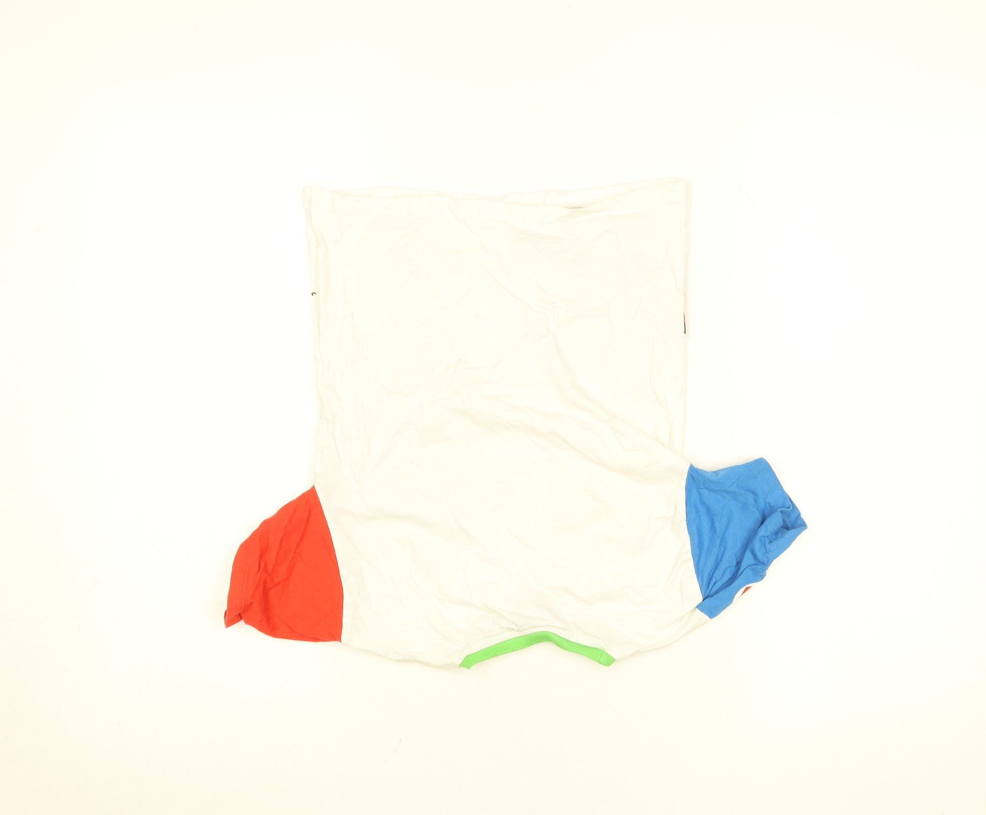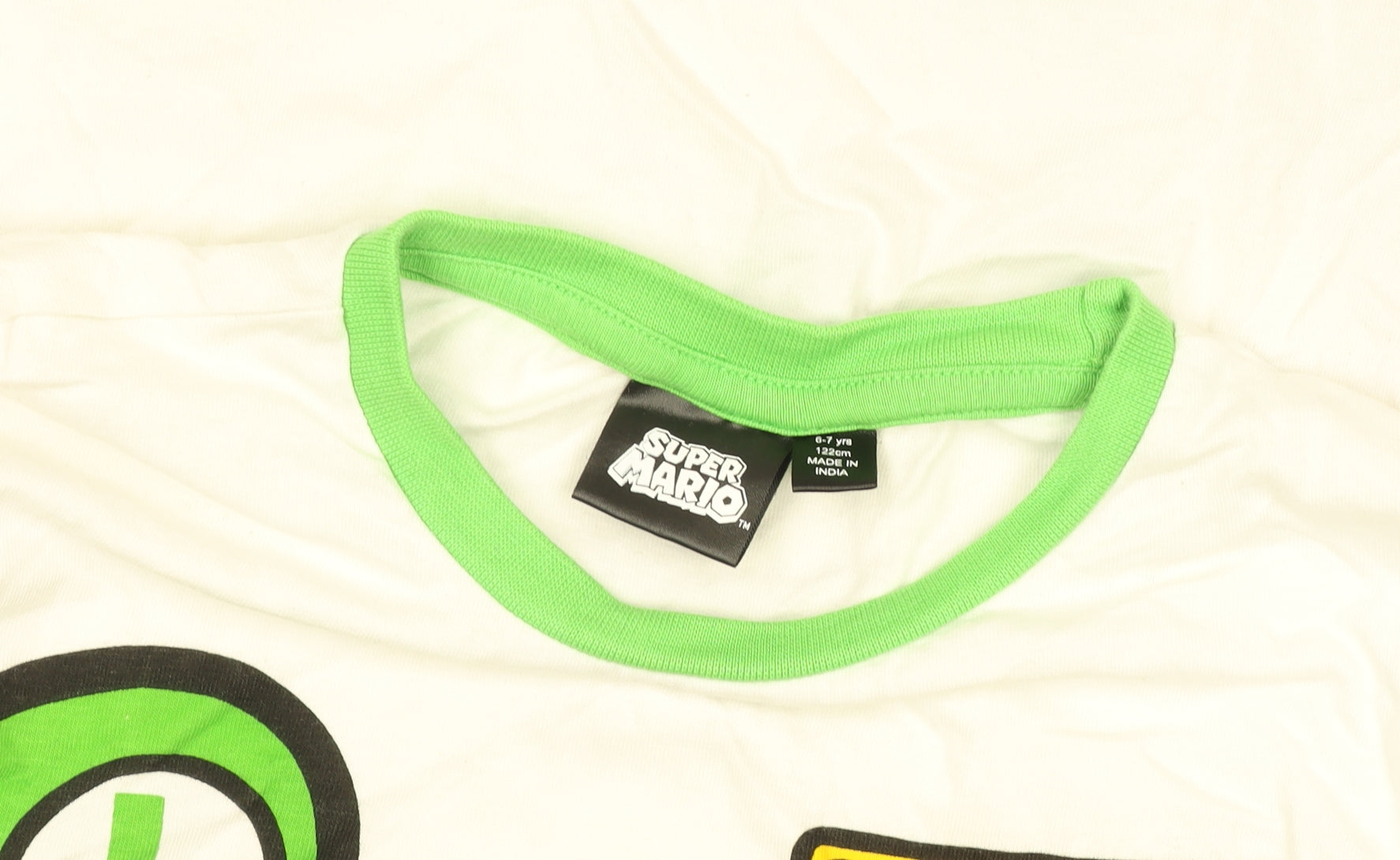 Add a touch of fun and nostalgia to your little one’s wardrobe with this officially licensed Super Mario boys’ T-shirt. Designed for ages 6-7 years, this multicoloured tee features vibrant graphics of Mario and Luigi against a white background, complete with a green crew neckline, red and blue contrast sleeves, and iconic game symbols. Perfect for young gaming fans, this short-sleeve top captures the energetic spirit of the beloved Nintendo franchise. Made from 100% cotton, the T-shirt is soft, breathable, and comfortable to wear throughout the day, ideal for casual outings, playtime, or school activities. The regular fit and pullover style ensure easy dressing and a relaxed feel that kids love. The lightweight jersey fabric provides flexibility and durability, making it suitable for the spring and summer months. Whether paired with jeans, shorts, or joggers, this Super Mario T-shirt makes a playful statement while offering everyday comfort. The design’s bright colours and cheerful imagery will delight young fans of the popular video game series. The item is in very good pre-owned condition, showing gentle wear and no visible flaws. Although it does not include original retail tags, it remains a well-preserved garment ready for its next adventure. A fantastic find for collectors and fans alike, this T-shirt makes an excellent gift for a child who loves gaming and iconic characters. Bring a touch of classic cartoon fun to their wardrobe with this high-quality Super Mario top that is both stylish and comfortable, combining nostalgic charm with practical everyday wear.