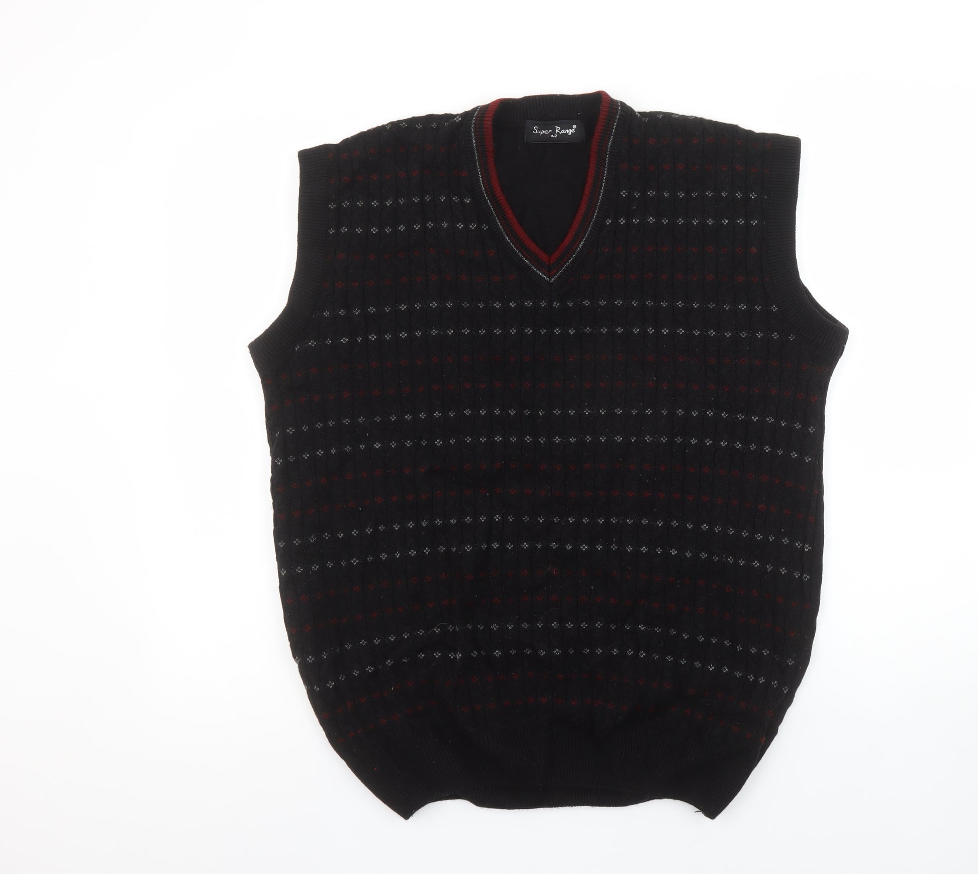 Add timeless sophistication to your wardrobe with this Super Range men's sleeveless jumper vest. Designed in a flattering regular fit, it is crafted from soft acrylic knit that offers lasting comfort, durability, and warmth throughout the cooler months. The striking black base is subtly highlighted with a fine geometric pattern in shades of red and grey, giving the piece a refined classic appearance suitable for both casual and smart-casual occasions. The V-neck design with ribbed trim detailing adds a neat, structured finish, making it easy to pair with shirts or t-shirts depending on your look. Perfect for layering under a blazer or jacket, this vest provides both style and functionality with its lightweight and breathable knit. Whether worn for the office, weekend gatherings, or an evening out, it effortlessly elevates your outfit. The timeless design ensures it will remain a versatile staple in your rotation for years to come. The acrylic material makes it easy to care for and machine washable, maintaining its shape and texture after multiple wears. In excellent pre-owned condition with no notable damage or marks, this jumper vest reflects quality and subtle elegance. A great addition for men who appreciate classic knitwear with a contemporary edge. Pair it with jeans or tailored trousers for an effortlessly sharp look that’s perfect for autumn and winter styling. Ideal for workwear, daily wear, or layering during transitional seasons.