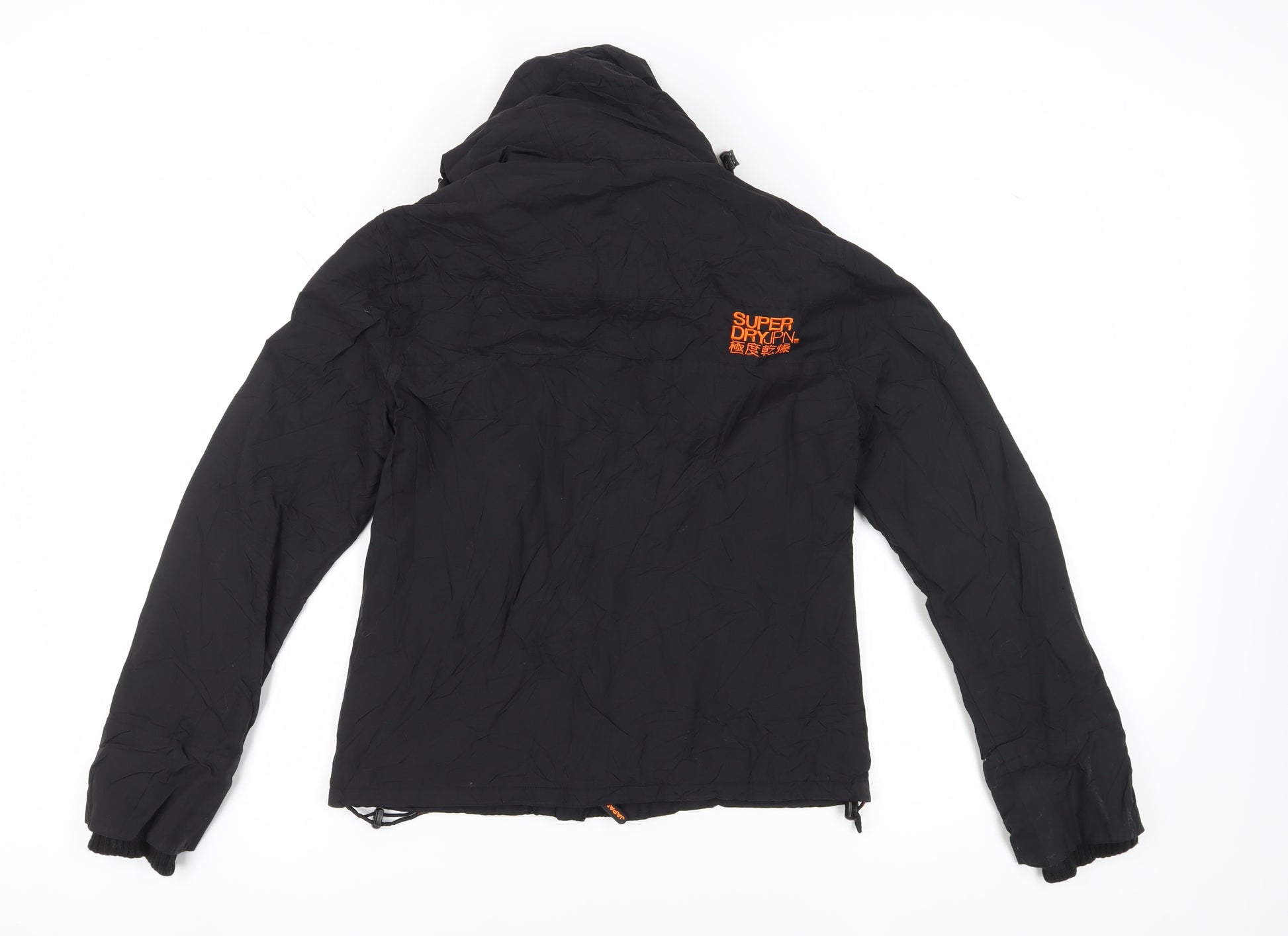 Stay warm and stylish with this Superdry Men's Hooded Jacket in size L. Ideal for casual wear during autumn and winter, this black jacket features a comfortable regular fit and stand-up collar, perfect for layering over your favourite outfits. Crafted with a durable outer shell made from 100% nylon and 100% polyamide, it provides excellent resistance against wind while being surprisingly lightweight. The polyester lining ensures added comfort during chilly days.The jacket boasts practical features such as a full zip closure, making it easy to slip on and off, while zipped pockets offer secure storage for your essentials. A signature Superdry logo accentuates the design, adding a touch of brand authenticity. With a mid-length profile, this jacket is suitable for versatile styling, whether you're heading out for an outdoor adventure or a relaxed weekend hangout.The versatile and unpatterned design ensures it can be paired effortlessly with both casual and smart-casual ensembles. Machine washable for easy care, this jacket is in excellent condition, showing no visible defects. Priced affordably, this Superdry jacket is a smart addition to any wardrobe, combining practicality with contemporary style. Upgrade your outerwear collection today.