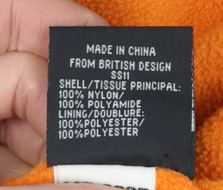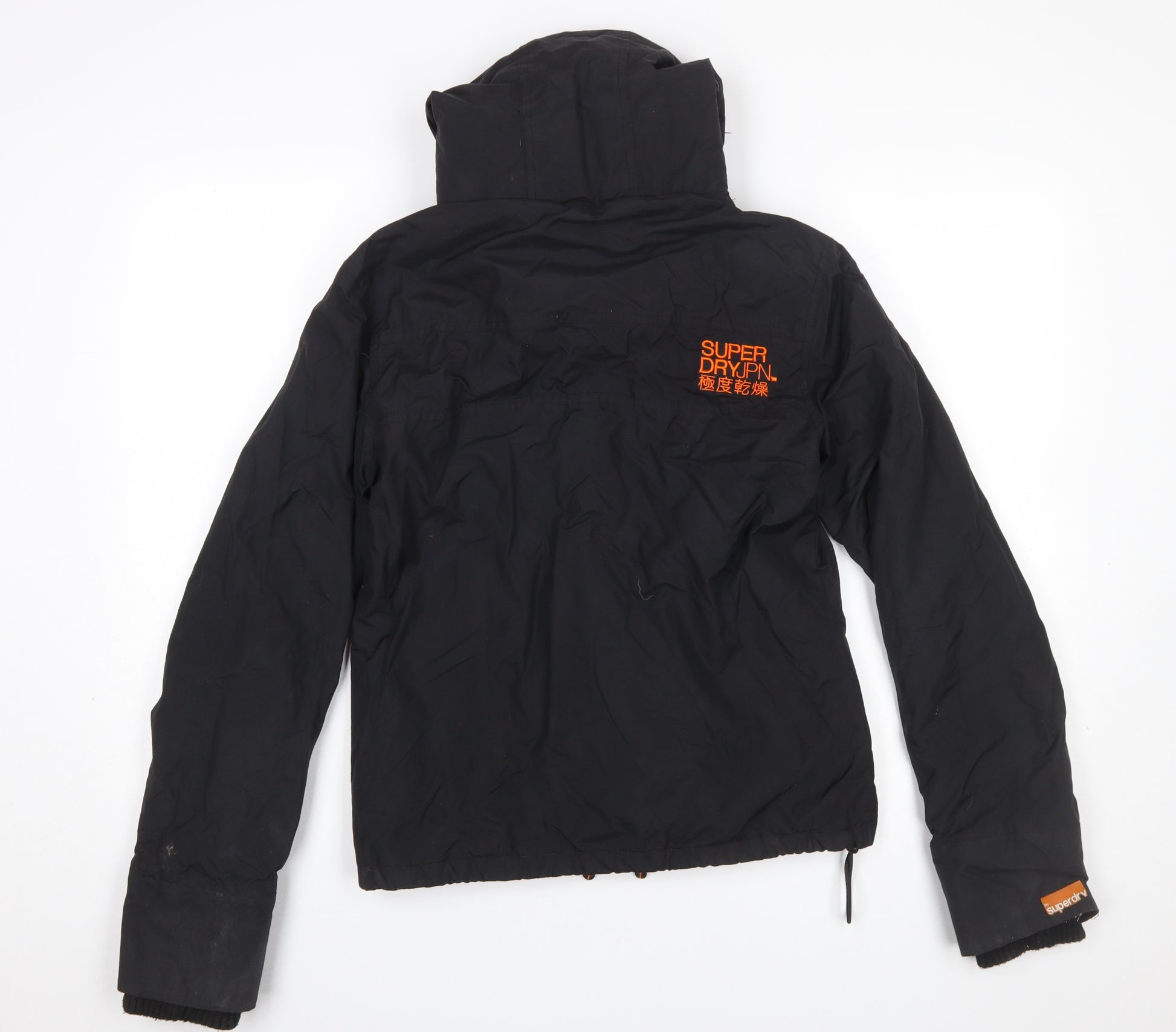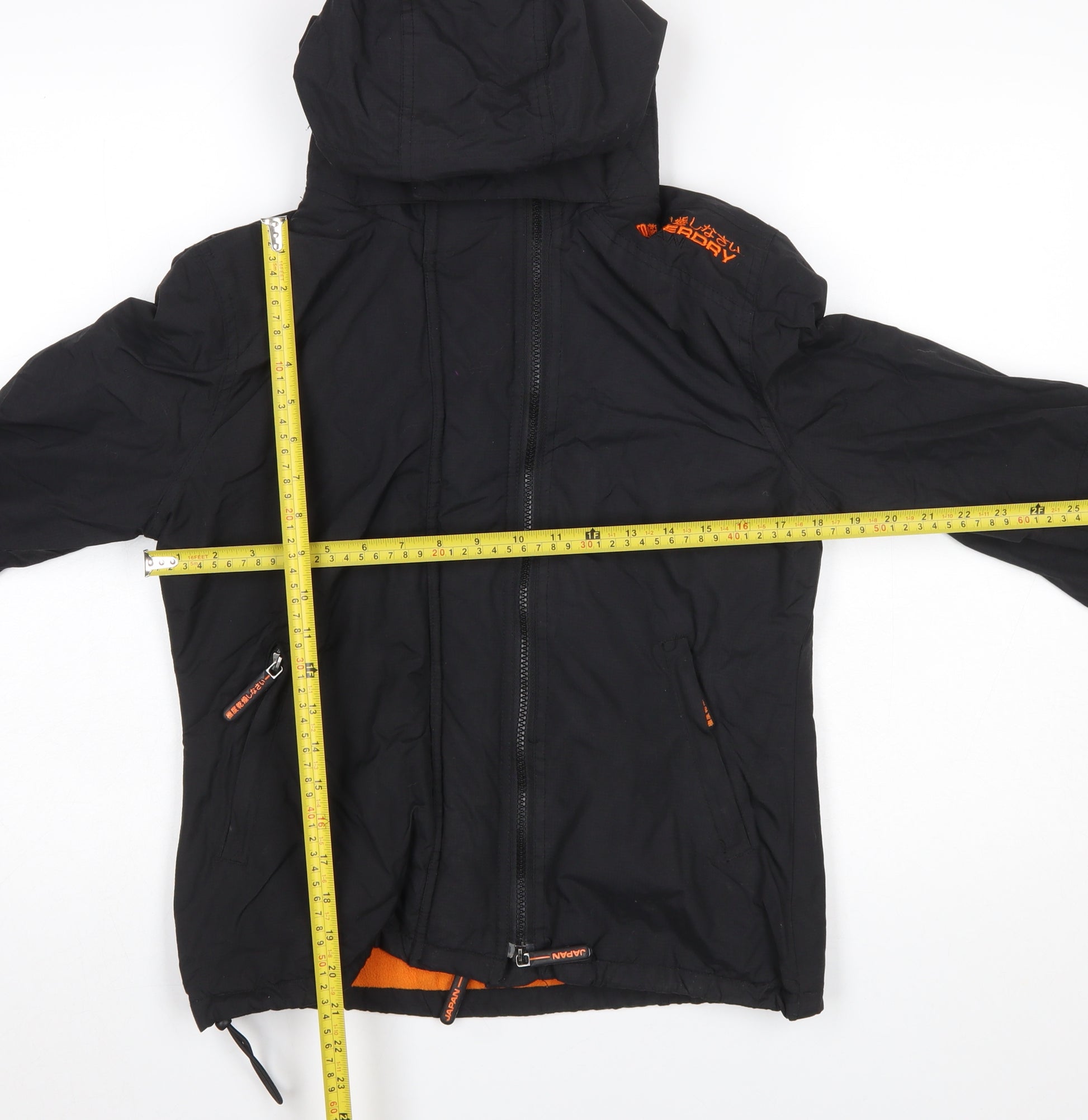 Stay stylish and protected from the elements with this Superdry men's black hooded jacket. Designed with a functional and modern edge, it combines outdoor practicality with the iconic Superdry aesthetic. The jacket features a durable outer shell made from nylon and polyamide, providing excellent wind resistance and reliable everyday wear. Its soft polyester lining ensures warmth and comfort, making it ideal for autumn and winter months. The full zip fastening with branded pulls, stand-up collar, and attached hood add to its practical appeal, while the two front zipped pockets offer functionality and convenience for storing essentials. Decorated with the bold Superdry logo embroidery in vibrant orange, this jacket stands out effortlessly while maintaining a clean and classic design. The regular fit allows freedom of movement, making it perfect for layering over casual outfits. Suitable for walking, hiking, or simply an everyday streetwear look, this versatile black jacket pairs well with jeans and trainers. With slight wear noted on the cuffs but in overall very good condition, this pre-owned Superdry piece ensures dependable style and durability for seasons to come. A perfect choice for those seeking modern design with performance-ready comfort and dependable urban flair.