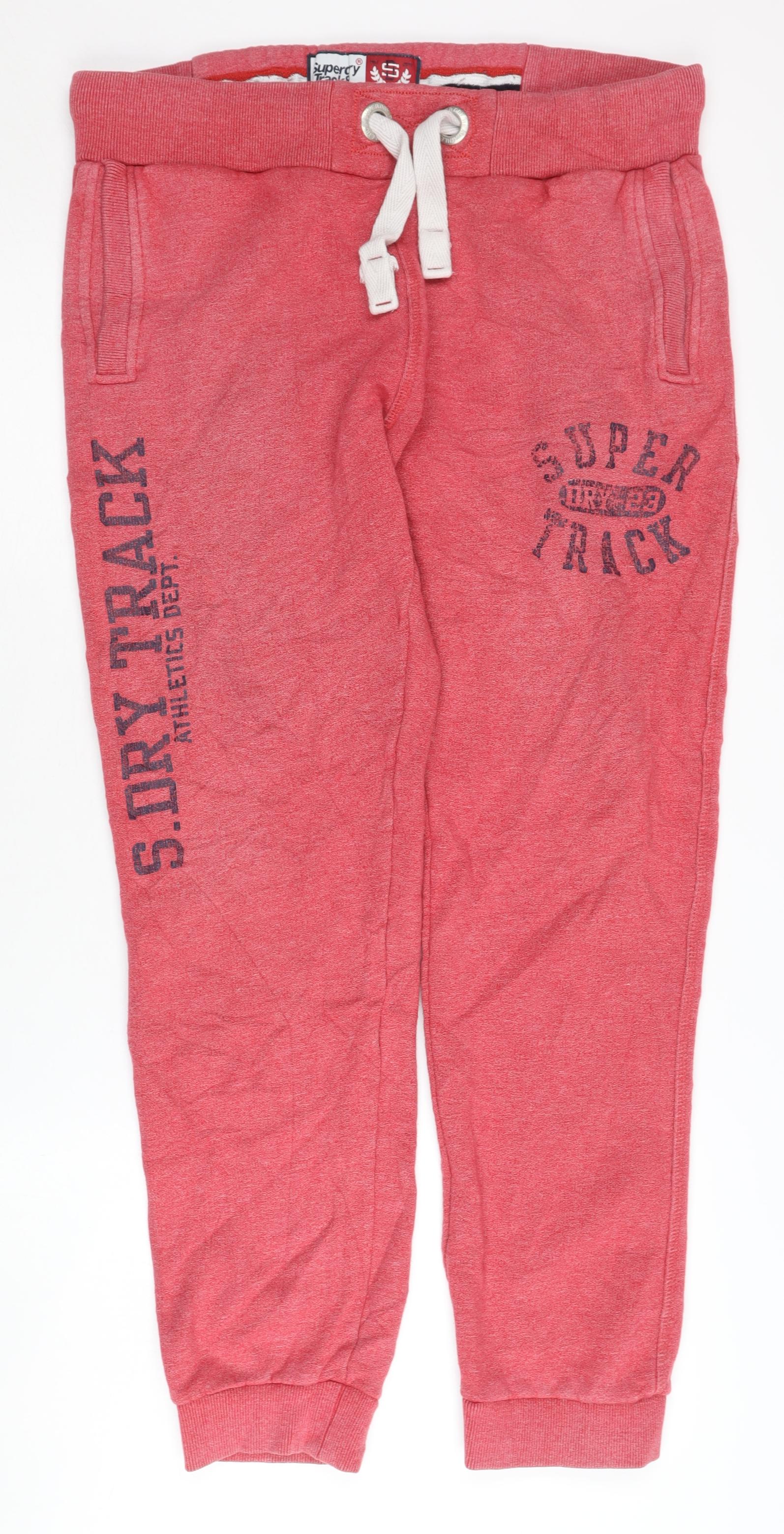 Elevate your casual wardrobe with these stylish Superdry jogger trousers, perfect for active men who value comfort and design. These red joggers are crafted from a blend of soft cotton and durable polyester, providing a comfortable and breathable fit ideal for training sessions at the gym or casual outings in spring, summer, and autumn. The relaxed fit and elastic waist ensure ease of movement, while the drawstring closure allows you to adjust the fit to your liking.The joggers feature a trendy tapered leg style, giving you a modern silhouette that's both fashionable and functional. Equipped with practical pockets, these trousers offer space to store essentials when you're on the go. The athleisure theme of these joggers makes them a versatile choice for gym activities or laid-back casual wear.Designed to be machine washable, these trousers offer the convenience of easy maintenance, ensuring they remain a staple in your wardrobe for seasons to come. In excellent condition with only slight wear visible, they are priced affordably, making them a savvy addition to your activewear collection. Choose these Superdry joggers for a blend of comfort, functionality, and style.