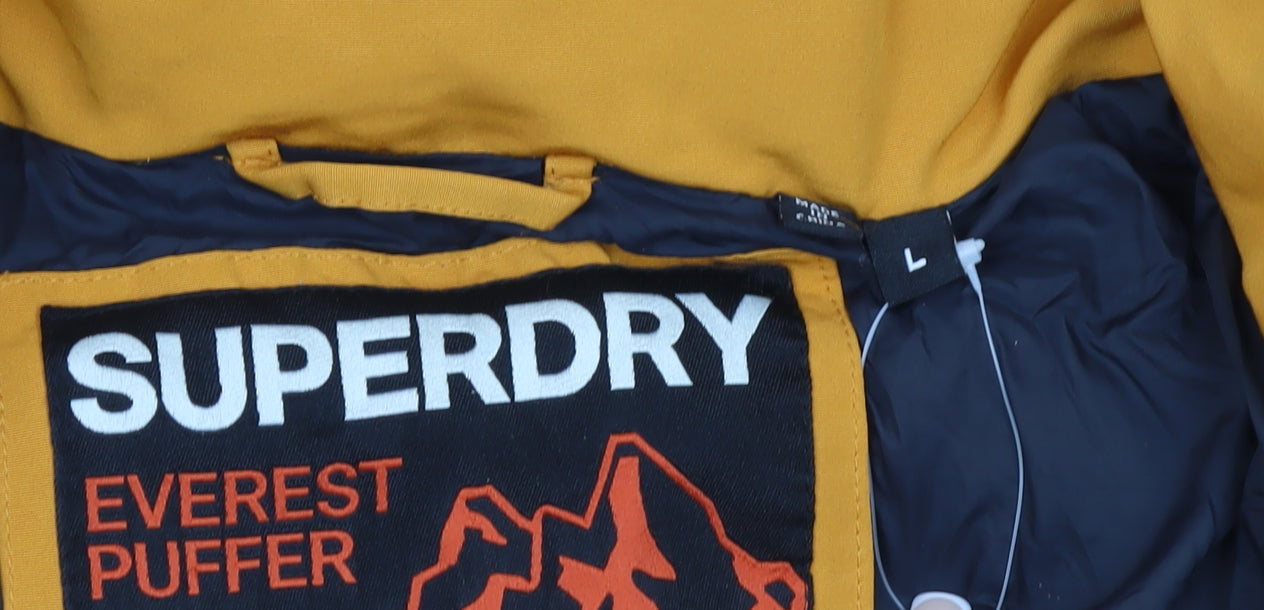 Stay warm and stylish this winter with the Superdry Men's Everest Puffer Jacket in a bold yellow colour. This mid-length puffer jacket combines practicality and comfort, making it an excellent choice for everyday wear, outdoor adventures, and travel. Designed with a durable polyester outer shell and fully lined interior, it provides outstanding insulation thanks to its thick synthetic padding. The robust build and water-resistant finish make it a dependable coat for cold and wet weather conditions.Featuring a practical hood with drawstring adjustment, the jacket ensures you stay protected from wind and rain. The zip-up front is complemented by a snap-button storm flap for added warmth and protection. Handy zip pockets at the sides let you store essentials securely while keeping your hands warm. Flexible ribbed cuffs maintain a snug fit, preventing cold air from entering.Adorned with the iconic Superdry logo on the rear shoulder and detailed with durable stitching, this jacket offers both function and a clean, modern look. Its regular fit provides enough room for layering without bulkiness, while the mid-length cut gives a flattering silhouette. The rich yellow tone adds a contemporary edge, making it stand out while matching comfortably with jeans, joggers, or casual trousers.Ideal for the winter season, this coat is perfect for walking, hiking, or general daily wear when temperatures drop. Although used, it remains in good overall condition with minor marks and a small rip at the pocket seam — both reflected in the price. The inside label confirms easy maintenance with machine wash compatibility, so keeping it fresh and ready for use is simple.Whether you're braving cold commutes or exploring the outdoors, the Superdry Everest Puffer Jacket offers dependable warmth, versatile styling, and signature Superdry quality — a must-have for any modern wardrobe.