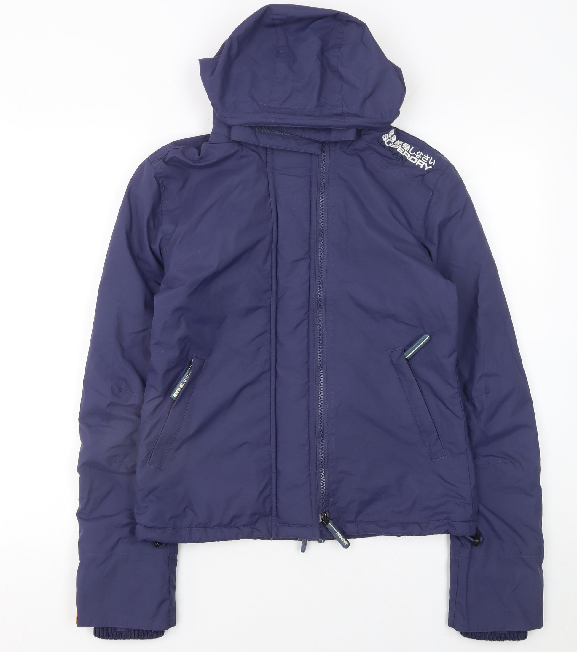 This Superdry Women’s Blue Hooded Windbreaker Jacket in size S combines sporty style with functional outdoor performance. Designed for casual and everyday wear, it is ideal for transitional seasons such as spring and autumn. Made from lightweight 100% polyamide, it offers comfort, flexibility, and protection against windy conditions while maintaining breathability. The inner lining is 100% polyester, ensuring a comfortable, smooth fit that helps to retain mild warmth without adding unnecessary bulk. The jacket features a full front zip closure, side zipped pockets for storing essentials, and an adjustable hood for additional protection during blustery weather. Subtle Superdry Japan branding accents the shoulder and back, adding a stylish urban touch that stays true to the brand’s distinctive aesthetic. Its short length and regular fit provide a flattering, modern silhouette perfect for layering over T-shirts or sweatshirts. This piece is versatile enough for city strolls, travel, or light outdoor activities, balancing fashion and practicality in equal measure. The deep blue tone easily coordinates with various outfits—pair it with jeans, leggings, or casual trousers for a relaxed, sporty ensemble. The lightweight microfibre fabric ensures you stay comfortable while remaining protected from the breeze. Despite being a pre-loved item in excellent condition, the jacket displays minimal signs of previous wear with no visible flaws or fabric damage. Clean and presentable, it’s ready to wear immediately upon arrival. The Superdry Women’s Blue Hooded Windbreaker Jacket is an ideal choice for those who value high-quality construction, sporty appeal, and functional streetwear styling. It represents the perfect balance between performance and everyday comfort, offering a timeless addition to your wardrobe that transcends seasonal trends. A reliable option for active lifestyles and on-the-go fashion, this jacket delivers enduring value and a touch of contemporary sport-inspired design.