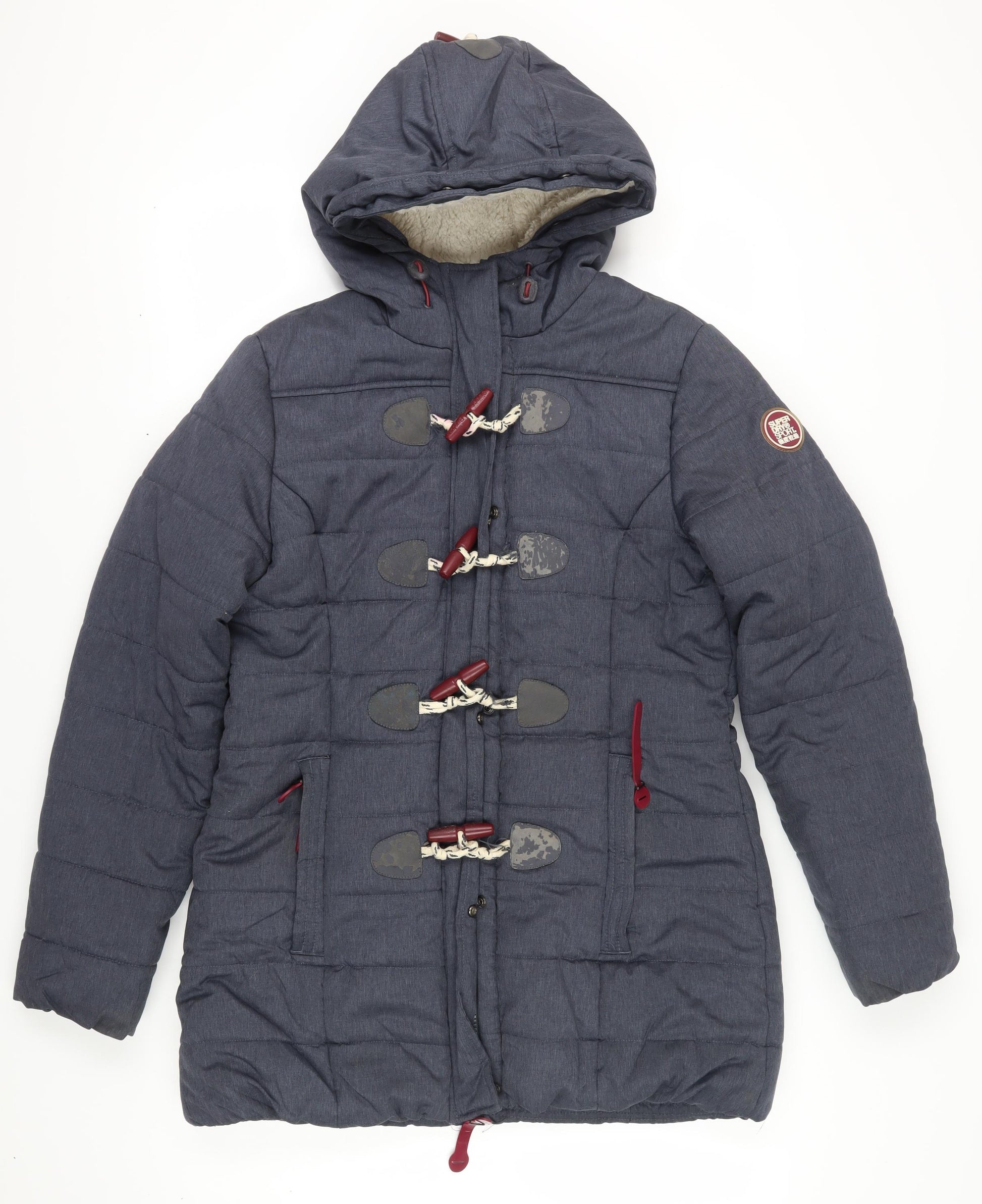 Stay warm and stylish with this Superdry Women's Duffle Coat in a vibrant blue. Perfect for daily wear, this coat offers a regular fit ideal for winter outings. The mid-length design provides sufficient coverage while maintaining a fashionable look. Lined and hooded, it keeps the cold at bay. Featuring toggle and zip closures, this coat combines practicality with style effortlessly. The softshell fabric ensures durability while the synthetic insulation keeps you cozy. With casual accents like toggles and a theme that suits everyday wear, this coat is a wardrobe staple. Machine washable for easy care, it remains in very good condition with only minor wear at the back. Grab this stylish coat today at an unbeatable price.