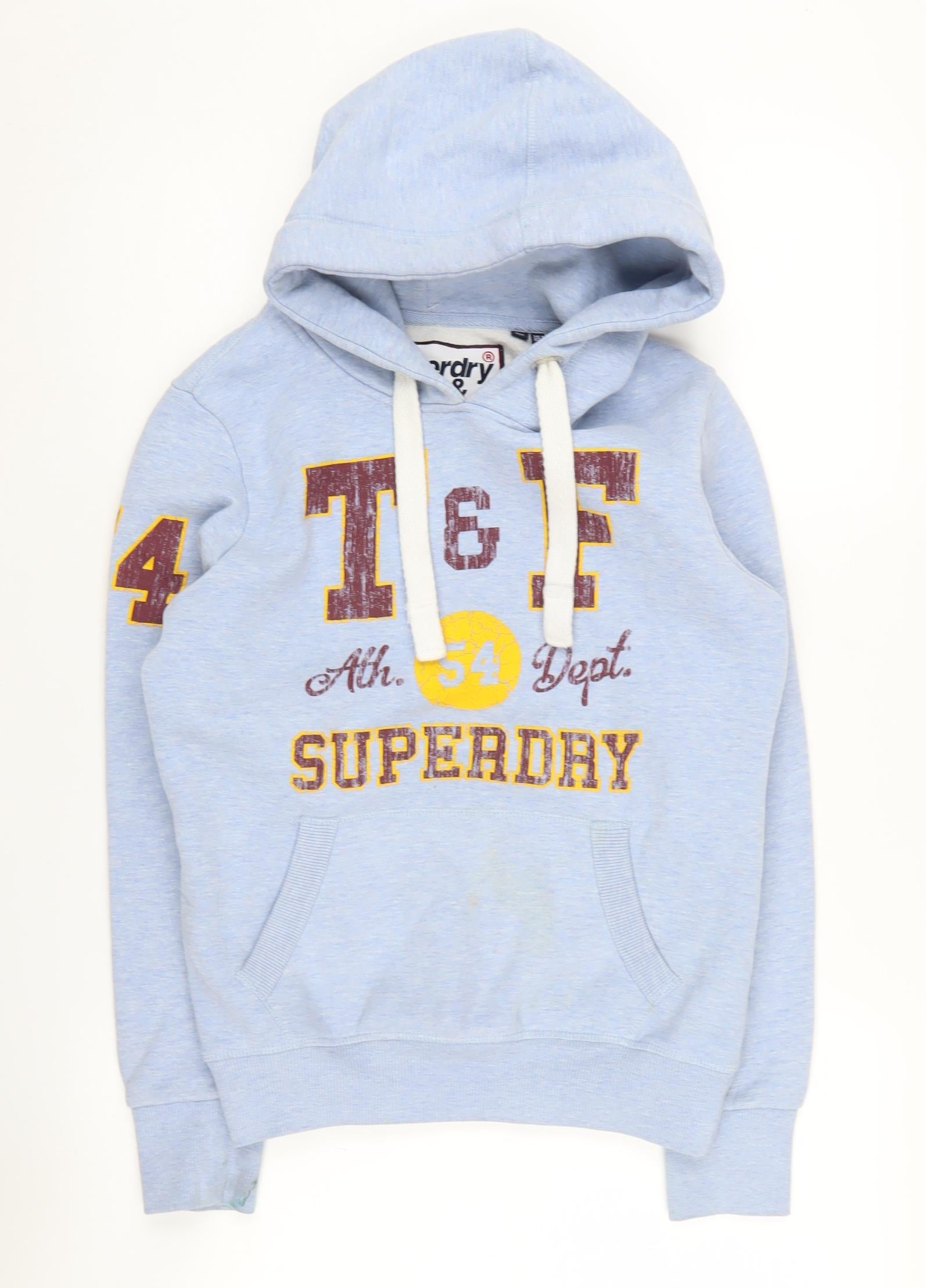 Discover comfort and style with this Superdry Women's Hoodie. Perfect for casual outings or athletic adventures, this blue pullover offers an effortless blend of fashion and function. Crafted from a soft jersey fabric with a balanced mix of 56% cotton and 44% polyester, this hoodie ensures warmth and breathability throughout the year. Featuring a classic crew neckline and long sleeves, it’s designed for those who seek both style and comfort.The hoodie comes equipped with a practical drawstring closure and a spacious hood to fend off the chill. Accentuated with the iconic Superdry logo, it embodies a sporty theme while also offering a practical front pocket for essentials. Easy to care for, it's completely machine washable, making it a convenient choice for your wardrobe.Despite showing some minor stains on the front, this piece maintains its charm and functionality, guaranteeing a stellar everyday outfit choice. Whether you're heading to the gym or enjoying a day out with friends, this hoodie is your go-to apparel for a stylish, sporty look without compromising on comfort. Embrace the versatility and choose this hoodie for any season and every occasion.
