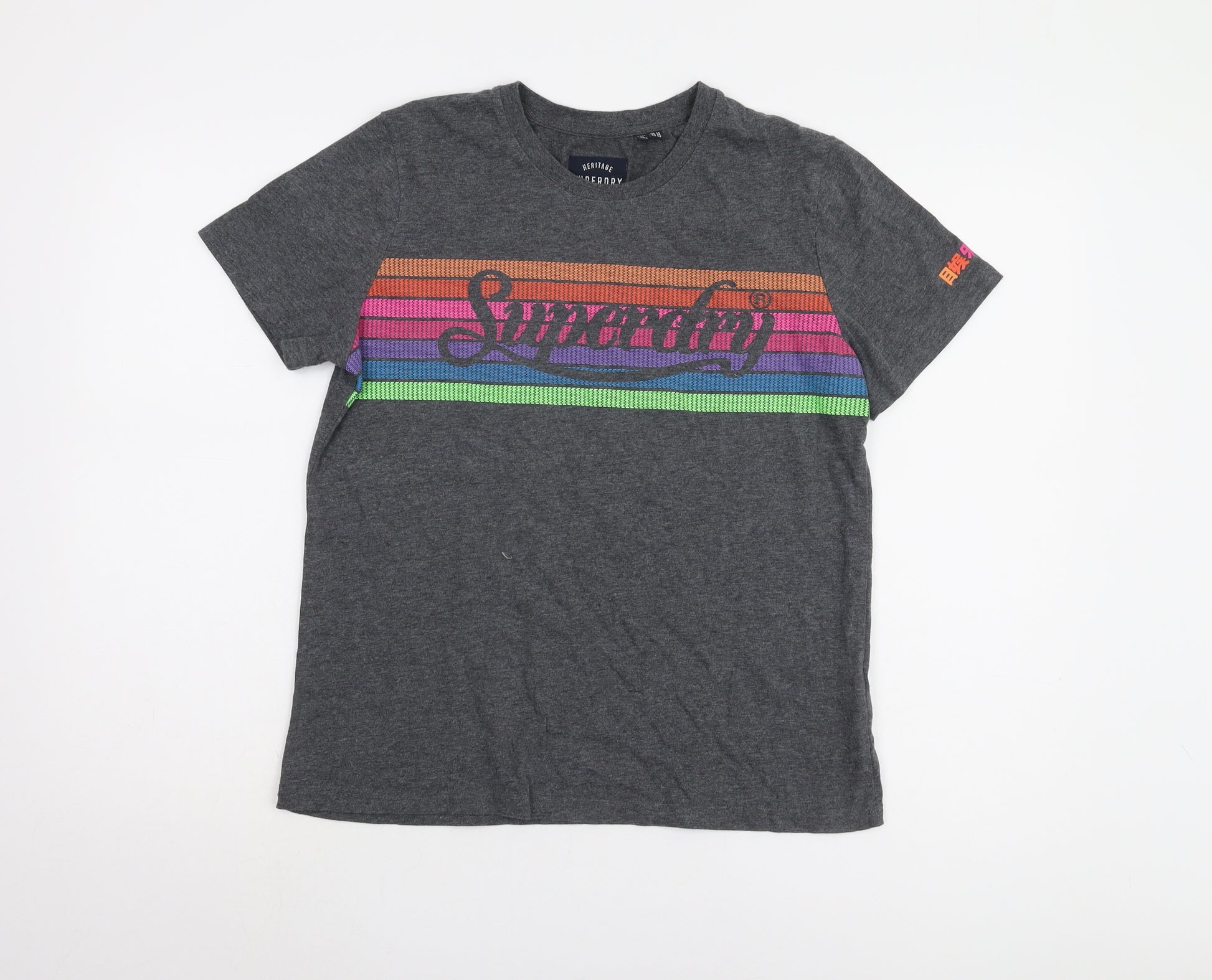 Introducing the iconic Superdry Women's T-Shirt, perfect for adding a touch of retro style to your casual wardrobe. This grey tee features a striking embroidered logo across the chest, accentuated by vibrant striped patterns that effortlessly catch the eye. Made for women, it's designed with a regular fit, making it a comfortable choice for all-day wear. Crafted from a soft blend of 60% cotton and 40% polyester, this jersey fabric t-shirt is breathable and ideal for all seasons. The crew neck and classic short sleeves add to its timeless appeal, offering a look that's both laid-back and fashion-forward. This t-shirt is perfect for casual outings, whether you're heading to a summer festival or enjoying a day out with friends. Machine washable for easy care, it's practical as well as stylish. Despite its slightly worn appearance, this top remains in excellent condition, promising lasting wearability. Embrace the retro theme while enjoying modern comfort and quality with this versatile piece. A must-have for any fashion enthusiast looking to enhance their everyday look with a touch of Superdry flair.