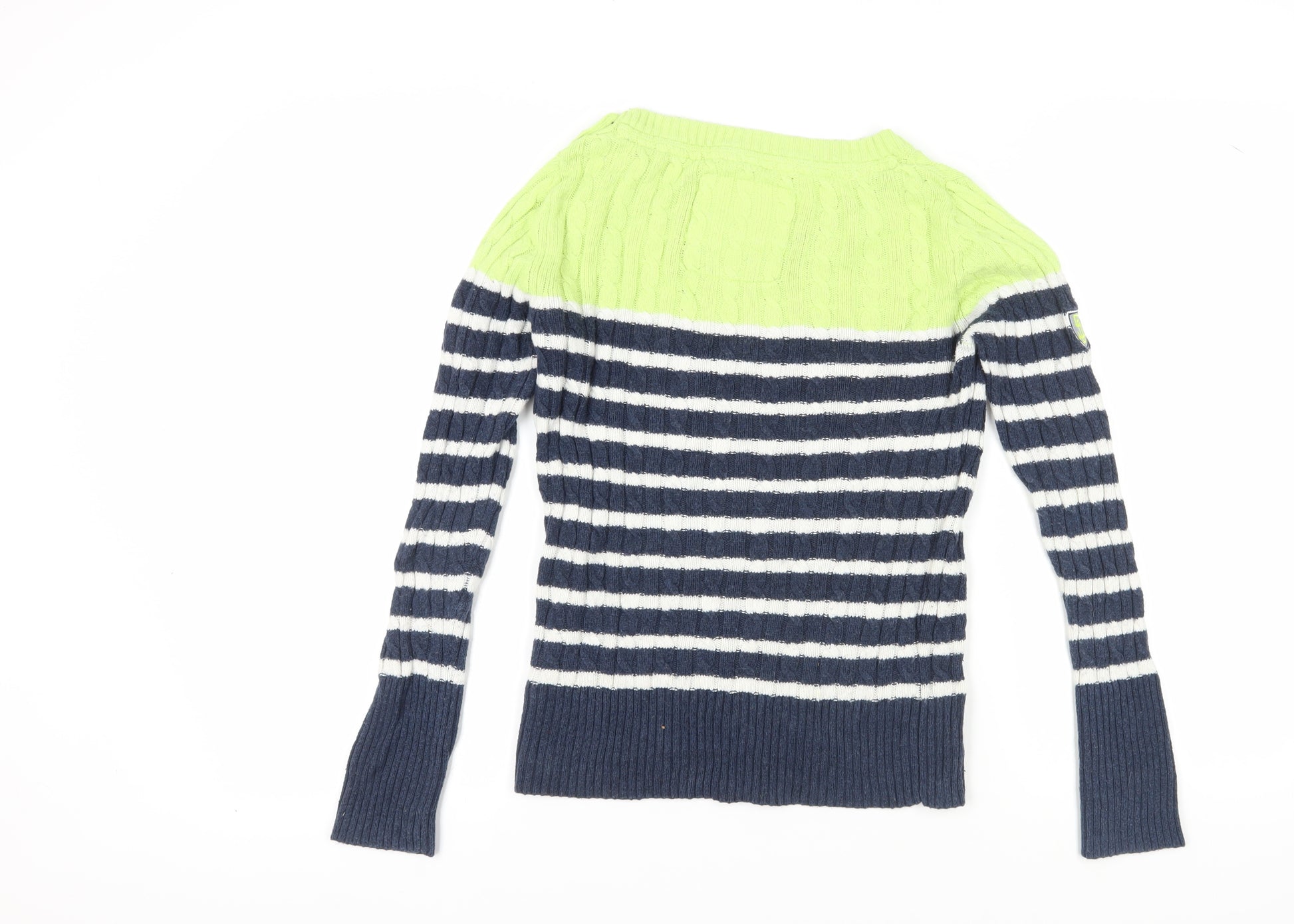 Elevate your chill-weather wardrobe with this stylish Superdry Women's Boat Neck Pullover in a striking multicoloured striped pattern. Crafted from a blend of premium materials including cotton and wool, this cable-knit jumper promises both comfort and durability. The relaxed, oversized fit ensures a flattering silhouette, while the long sleeves and boat neck design add a touch of elegance. Perfect for casual outings, this vintage-themed piece is versatile enough for a variety of occasions, keeping you warm and fashionable throughout the winter season. Accented with the iconic Superdry logo, this jumper exudes a unique charm, making it a must-have addition to your collection. Whether you're layering up for a cozy night in or stepping out for a casual meet-up, this pullover seamlessly blends style with function.