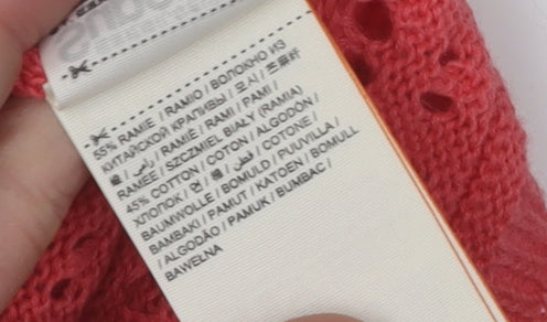 This vibrant red SuperDry women's jumper, designed in an open-knit style, is perfect for a casual and trendy summer look. With its alluring cold shoulder sleeves and comfortable round neckline, this pullover combines style and ease. The blend of ramie and cotton ensures breathability, making it ideal for warm weather. Despite the absence of tags, this jumper remains in excellent condition, ready to enhance your wardrobe. Perfect for casual outings or relaxed social gatherings, this jumper offers a fresh and stylish appeal.