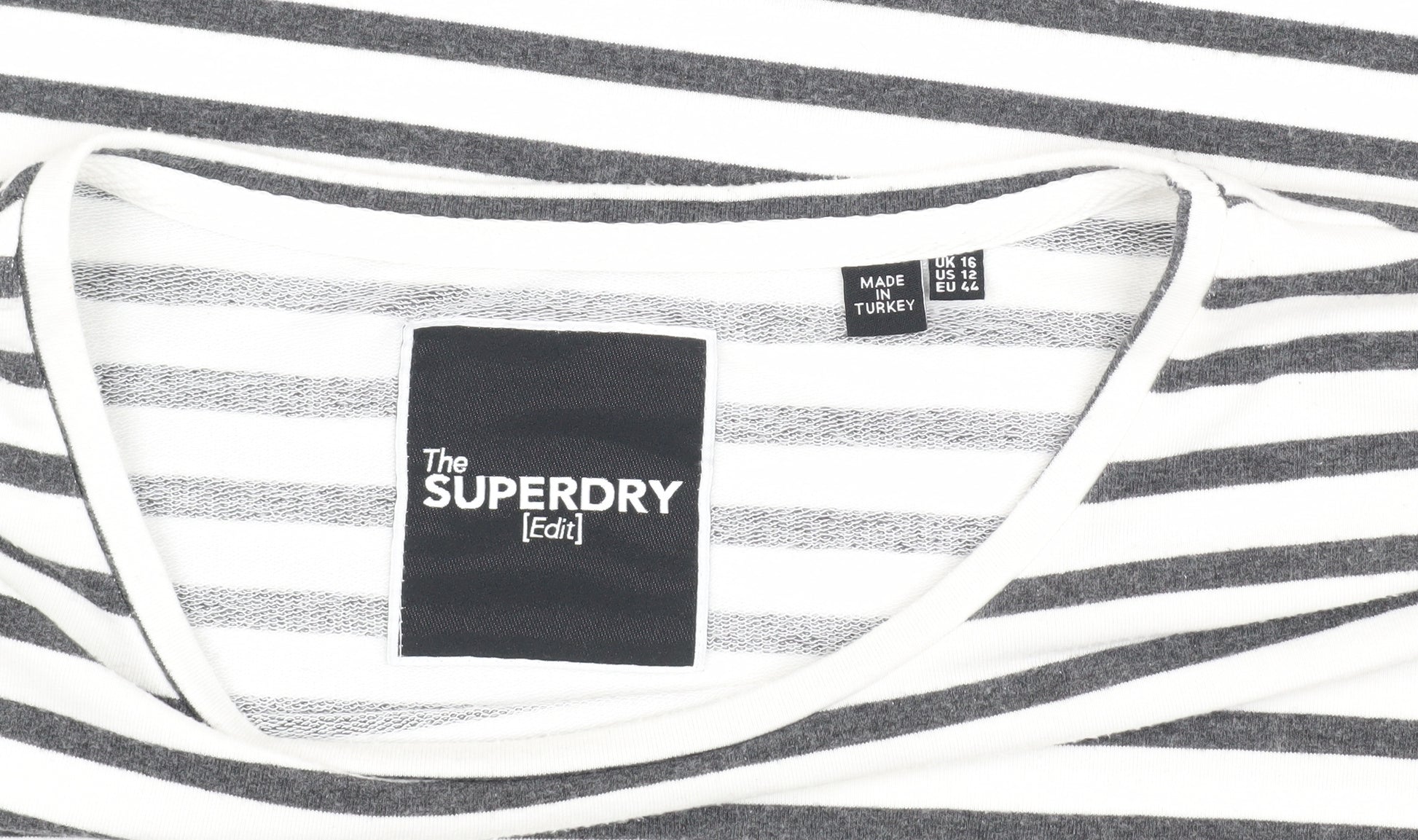 Discover effortless style with this Superdry women's striped long sleeve T-shirt, designed for casual charm and comfort. The chic white and black stripes offer a timeless look, perfect for everyday wear. Made from 100% cotton jersey fabric, this breathable and lightweight top ensures all-day comfort and ease. The round neckline and regular fit give a classic silhouette, making it a versatile addition to your wardrobe. Ideal for spring and autumn, this pullover style T-shirt pairs beautifully with jeans or skirts for a laid-back yet stylish ensemble. Suitable for various casual occasions, its machine washable nature ensures easy maintenance. Elevate your basics with Superdry's modern twist on a classic piece.