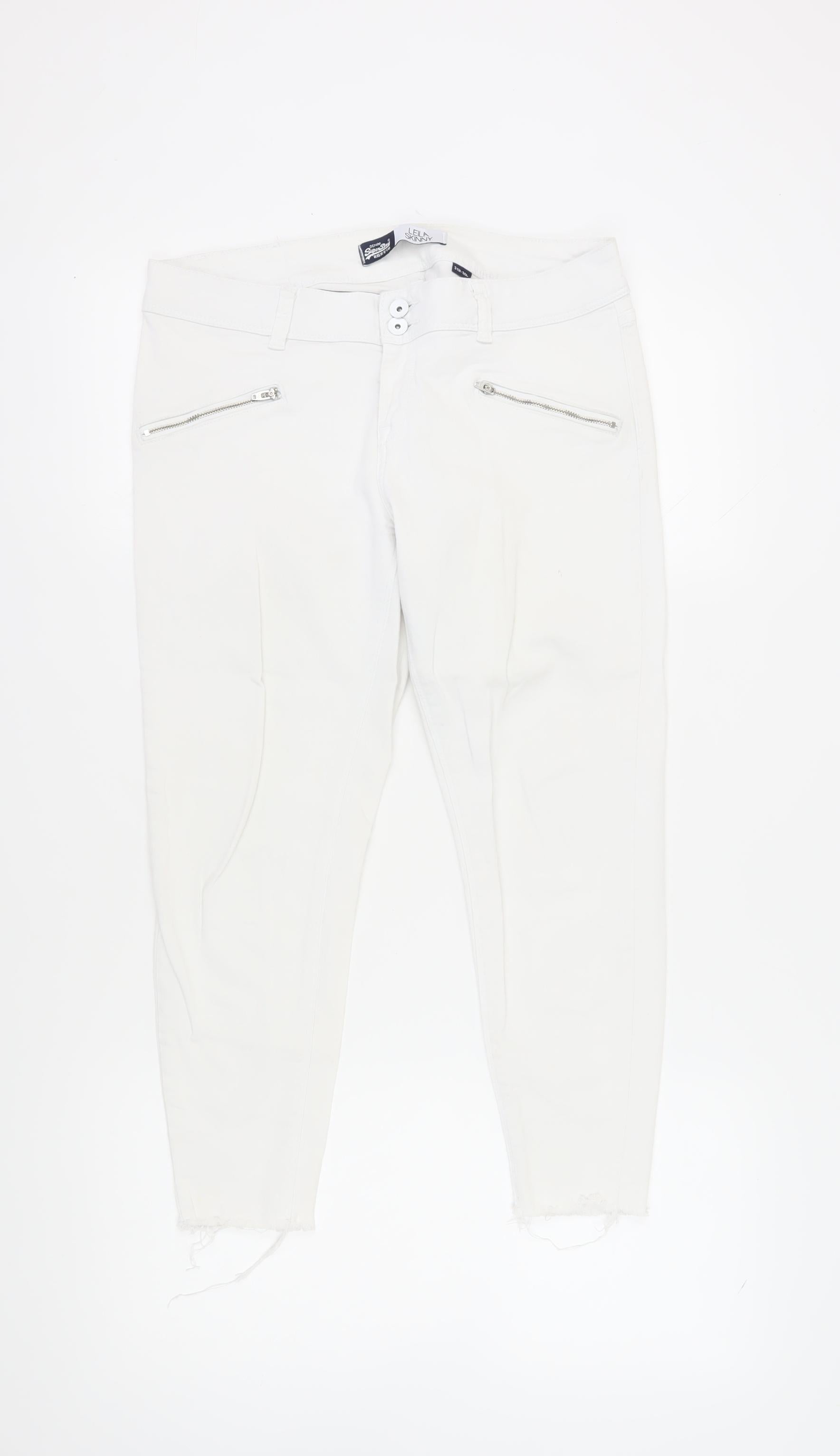 Discover an essential addition to your wardrobe with these Superdry Women's White Skinny Jeans. Designed in a sleek 'Leila' model, these jeans bring a modern touch to any ensemble. Crafted with a focus on comfort and flexibility, the cotton-elastane blend ensures a soft touch and a perfect fit, allowing freedom of movement with style. The 31-inch waist and 30-inch inside leg make these jeans the ideal choice for those seeking both style and functionality.Enjoy the classic features that set these jeans apart. With a 5-pocket design, they offer practical storage while maintaining a streamlined appearance. The zip accents add a touch of edge, ensuring you stand out in any setting. Machine washable and easy to care for, these jeans are crafted from light-wash denim, making them perfect for the warmer months.The adjustable waist and slim fit strike the perfect balance between fashion and ease, rendering them suitable for various occasions from casual outings to more stylish affairs. As these jeans are in excellent condition, they offer you the look of new attire without the new price tag.Ready to transform your look? Embrace the versatility and elegance of these Superdry Skinny Jeans and make them a cornerstone of your outfit rotation.