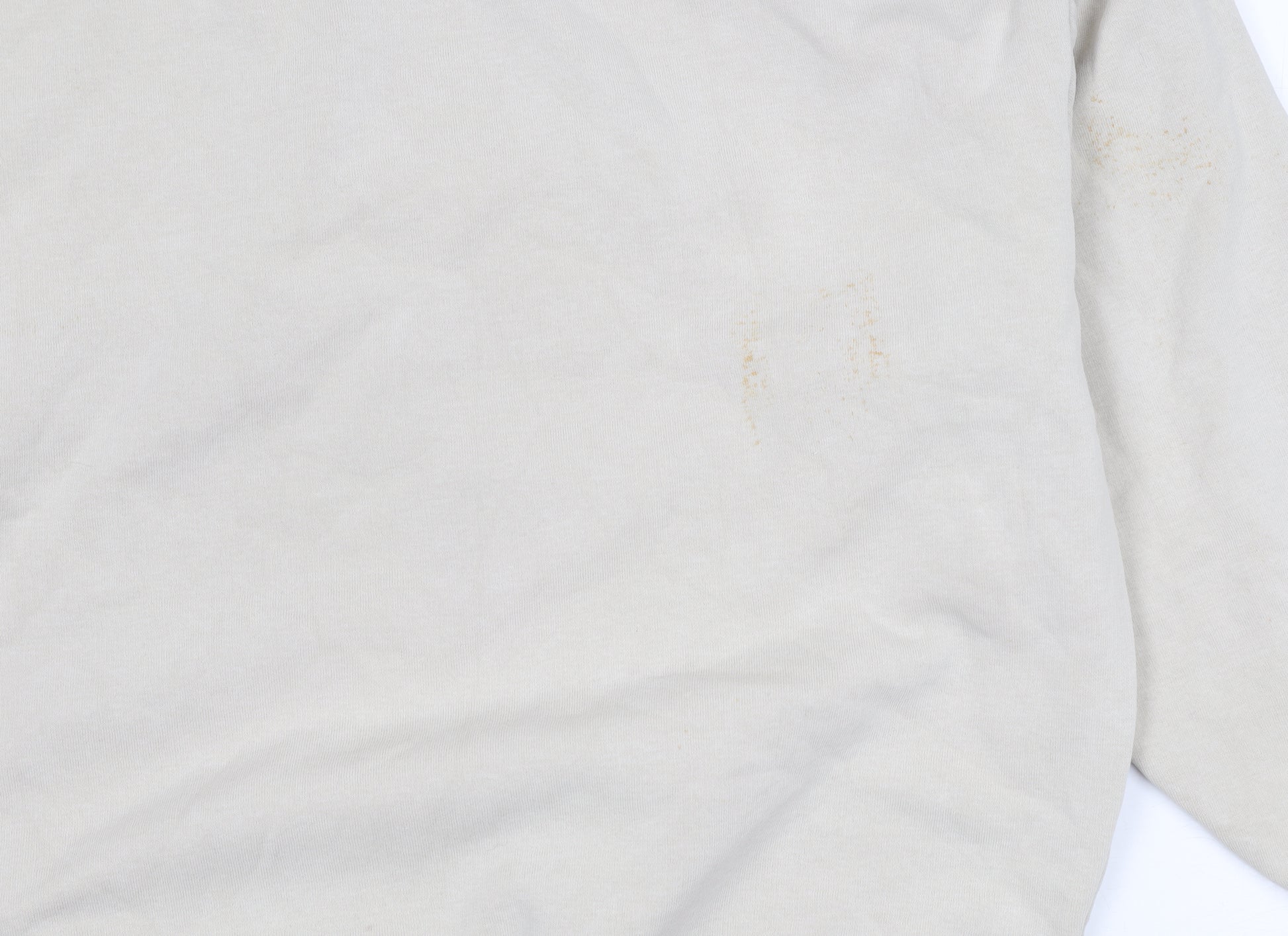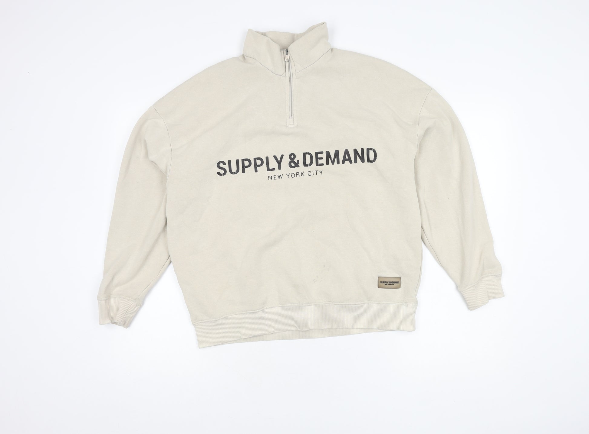 Elevate your casual wardrobe with this stylish Supply & Demand sweatshirt, perfect for everyday wear. Designed thoughtfully for unisex adults, it features a classic high neck and long sleeves to provide warmth and comfort throughout your day. The sweatshirt comes in a versatile beige colour, allowing for easy pairing with various ensembles. The distinct logo accent on the front adds a touch of brand identity, making it a standout piece. Featuring a convenient 1/4 zip closure, this sweatshirt ensures easy on-and-off while providing ventilation options. Crafted carefully with high-quality cotton, it promises comfort and durability. Although lightly worn with visible stains present, it remains in good condition and ready for regular use. Complement your casual outfits effortlessly and enjoy the warm embrace of this plush jumper, ideal for cool evenings or lounging at home. Please note that it comes in a size L, designed to fit comfortably with a regular fit style. Don't miss out on this chic addition to your wardrobe at an attractive price.