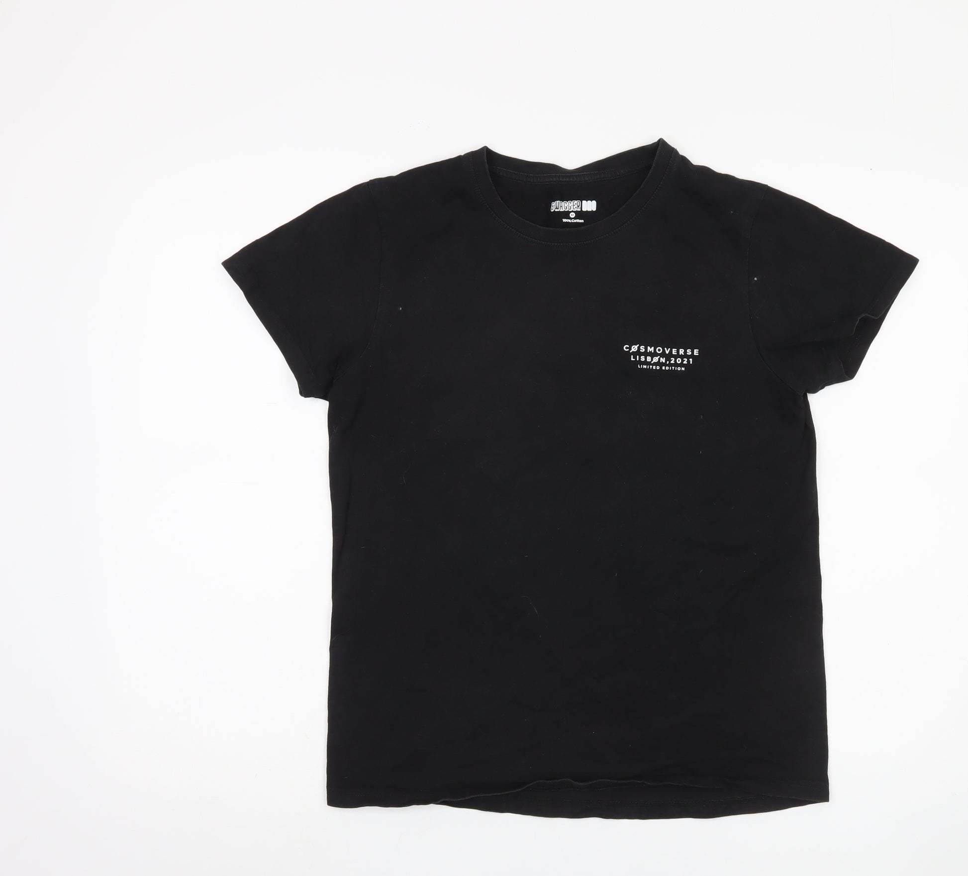 Elevate your casual wardrobe with the Swagger DAO Men’s T-Shirt in classic black. This eye-catching piece features a distinctive graphic print celebrating the 'Cosmoverse Lisbon 2021' event. Crafted from 100% cotton, the T-shirt is breathable and comfortable, making it ideal for all seasons. The crew neck and short sleeves offer a relaxed yet stylish fit, perfect for laid-back days or for adding a touch of flair to your everyday attire. The logo accent adds an element of uniqueness, making it a conversation starter. Despite light wear, it remains in excellent condition, showcasing no damages or imperfections. Machine washable, it promises easy care and maintenance. Medium size fits regular proportions, designed to suit any style preference. Whether for a casual day out or just lounging at home, this limited edition piece will quickly become a favourite in your collection. Snap it up now as a collectible or a timeless graphic piece to pair with jeans or shorts.