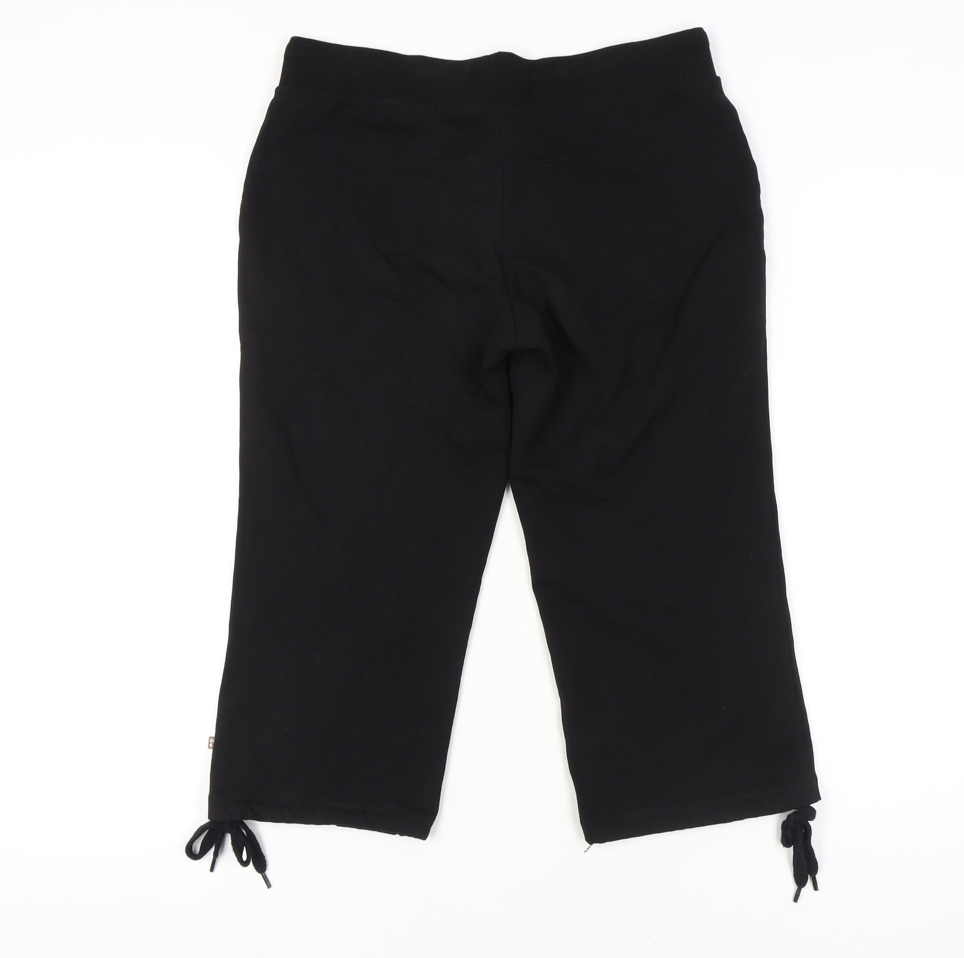 Experience comfort and style with these women's black cropped trousers from Sweaty Betty, designed for the modern activewear enthusiast. The trousers are crafted from a soft blend of 92% cotton and 8% elastane, ensuring breathability and stretchability for any active occasion. With an elastic waist and a drawstring closure, adjust the fit to your liking for a secure yet comfortable wear during workouts or casual outings. These versatile trousers feature a regular fit, making them suitable for a variety of body types, while their plain black colour ensures they pair effortlessly with any top. Ideal for any season, the machine washable design adds to their practicality, while the absence of patterns establishes a minimalist, streamlined look. Suitable for activewear occasions, these trousers are tailored to keep you comfortable during yoga, gym sessions, or just when lounging around. Despite the lack of original sales tags, they are in excellent condition with no visible defects, offering a stylish yet thrifty purchase. Whether you're engaging in a workout or enjoying a casual day out, these trousers are the perfect addition to your activewear collection.