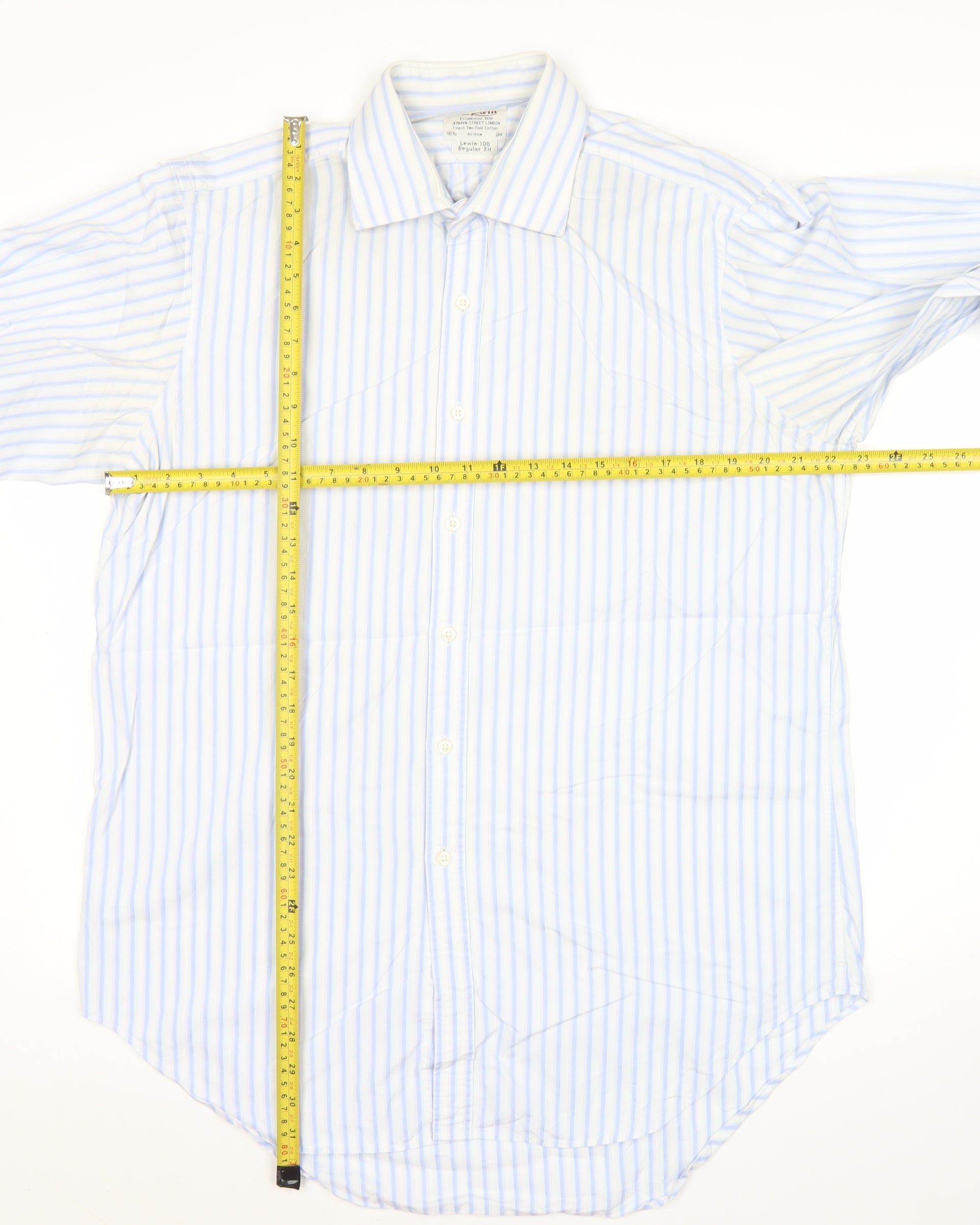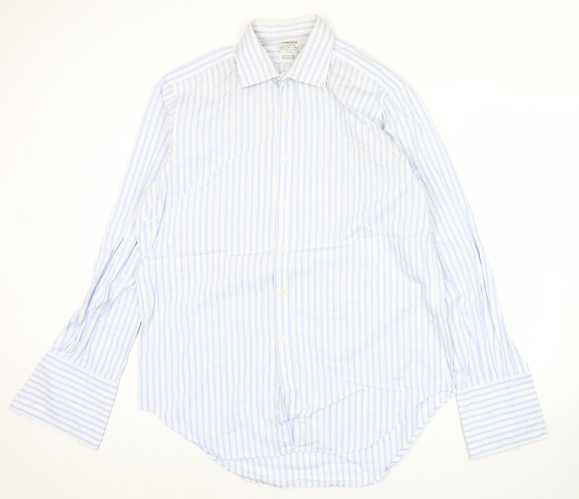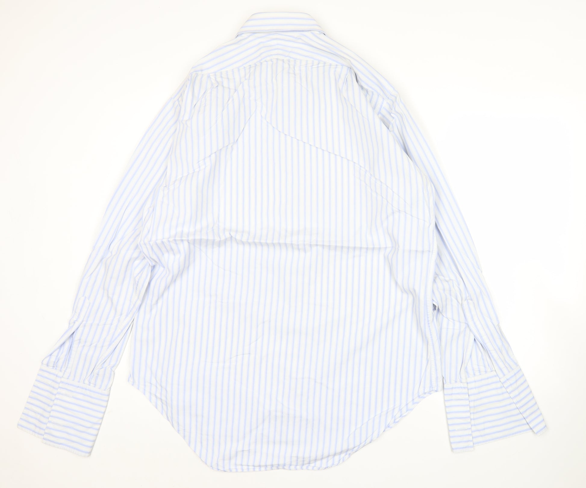 This T.M. Lewin men’s formal shirt is an excellent choice for the modern gentleman who values timeless style and dependable quality. Crafted from 100% finest two-fold cotton, it provides a crisp, breathable and durable fabric that ensures long-lasting wear while maintaining a refined appearance. Designed in a fresh blue stripe pattern, it brings a touch of sophistication to any outfit, making it an ideal option for both professional and formal occasions.The shirt features a size 16.5-inch (42 cm) collar with a regular fit cut, offering comfort and room without compromising on a polished silhouette. Its long sleeves with barrel cuffs add a classic finishing touch, while the button closure provides simplicity and ease of styling. With a collared neckline and pointed collar style, this shirt perfectly complements ties and jackets, making it an essential wardrobe piece for business meetings, weddings, and smart social events.Measured with a chest size of approximately 110 cm and a shirt length of 80 cm, this shirt is proportioned for a flattering drape that will look sharp tucked in with trousers. The woven fabric construction enhances its durability, while the easy-care cotton makes it a practical choice for regular wear. Designed for all seasons, this versatile shirt pairs seamlessly with suits for a professional setting or smart trousers for an elevated evening look.Condition-wise, the shirt is in excellent pre-owned condition, with only light creasing present and no visible flaws, ensuring plenty of wear left for its next owner. T.M. Lewin, established in 1898 on Jermyn Street, London, is renowned for their exceptional tailoring and attention to detail. This shirt embodies the heritage and craftsmanship the brand is known for.A wardrobe staple for any discerning gentleman, this T.M. Lewin blue striped cotton shirt is the perfect choice to upgrade your office rotation or add a refined touch to formal occasions. Its combination of high-quality fabric, comfortable regular fit, and versatile striped design make it a classic piece to enjoy for years to come.