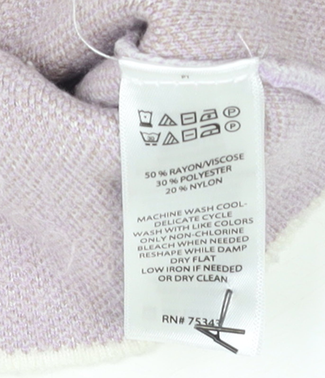 Elevate your knitwear collection with this beautiful Tahari women’s jumper in a refined beige and lilac check pattern. Expertly designed for both comfort and style, this mock neck pullover offers a timeless appeal with a modern twist. Made from a soft and lightweight blend of 50% viscose, 30% polyester, and 20% nylon, it provides a smooth handle and excellent wearability — perfect for cooler autumn or winter days. Featuring a relaxed fit and long sleeves, this jumper drapes comfortably across the body, making it ideal for everyday wear, casual outings, or smart layering. The check design adds a classic yet contemporary touch, instantly brightening your outfit with its light pastel tones. The mock neck detail brings subtle sophistication, while the breathable knit ensures lasting comfort. Designed for practicality as well as style, it’s machine washable for easy care, keeping it fresh and ready to wear throughout the season. Pair this versatile jumper effortlessly with jeans, trousers, or skirts for an elegant, polished look that transitions seamlessly from casual afternoon meetups to relaxed office settings. This Tahari piece embodies understated luxury and refined simplicity, offering excellent quality and gentle warmth with a soft texture that feels delightful on the skin. Perfect for modern women who value timeless design blended with everyday comfort, it’s a wardrobe essential that never goes out of style. In excellent pre-loved condition with no visible flaws, it’s ready to be enjoyed for many seasons ahead.