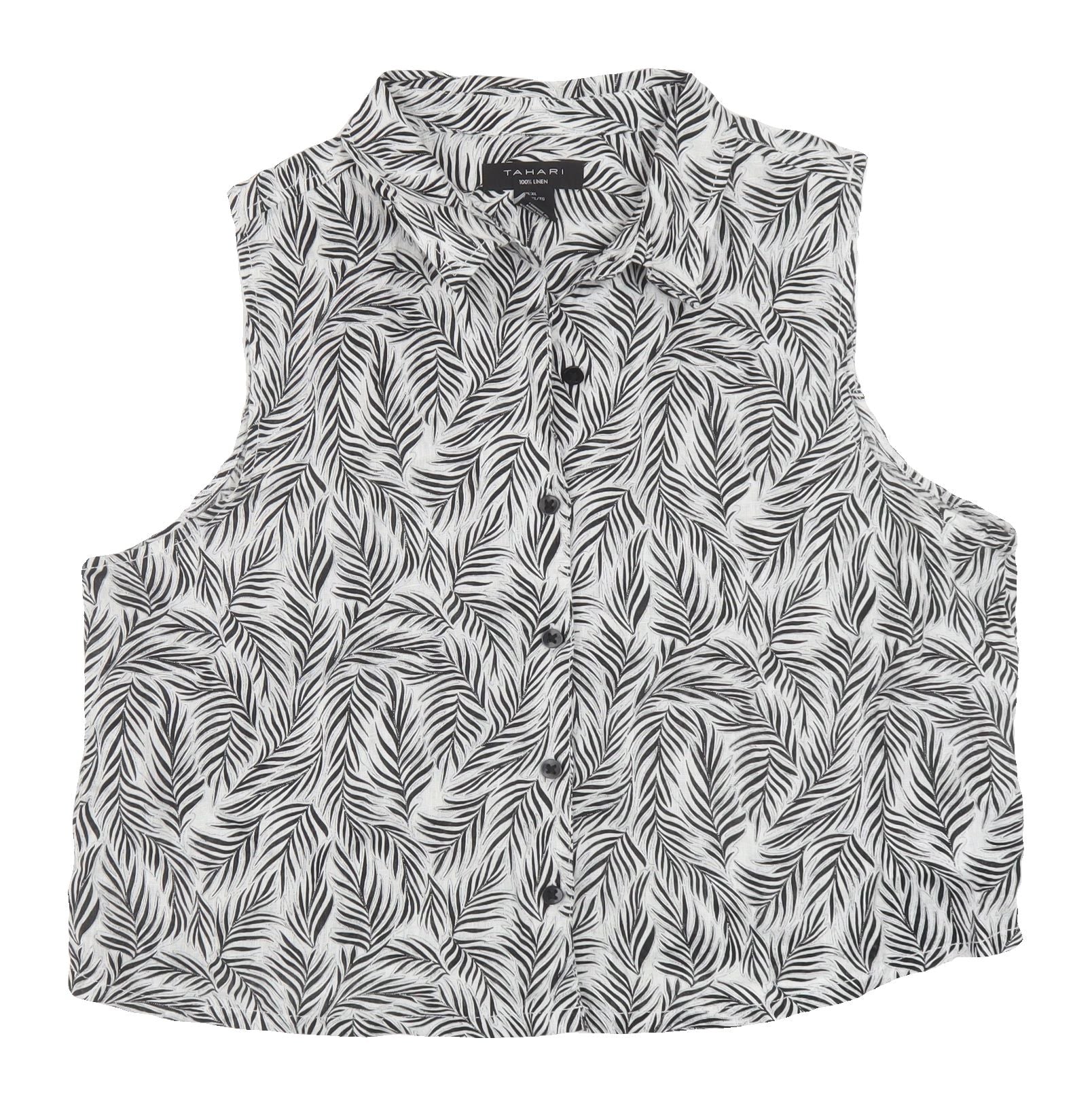 Introducing a stylish and versatile addition to your wardrobe with the Tahari Women's Black XL Geometric Linen Blouse. Crafted from 100% linen, this blouse offers both comfort and breathability, making it a perfect choice for warm summer days. The classic collared neckline and sleeveless design bring a sophisticated yet effortless touch to any ensemble, while its woven fabric provides a textured finish that enhances the geometric pattern's allure. Ideal for casual occasions, this black blouse stands out with its timeless aesthetic, effortlessly complementing a range of outfits. Experience quality and style with Tahari, a brand known for its exceptional craftsmanship and attention to detail. Don't miss the opportunity to own this new with tags piece, a must-have staple for any fashion-forward wardrobe.
