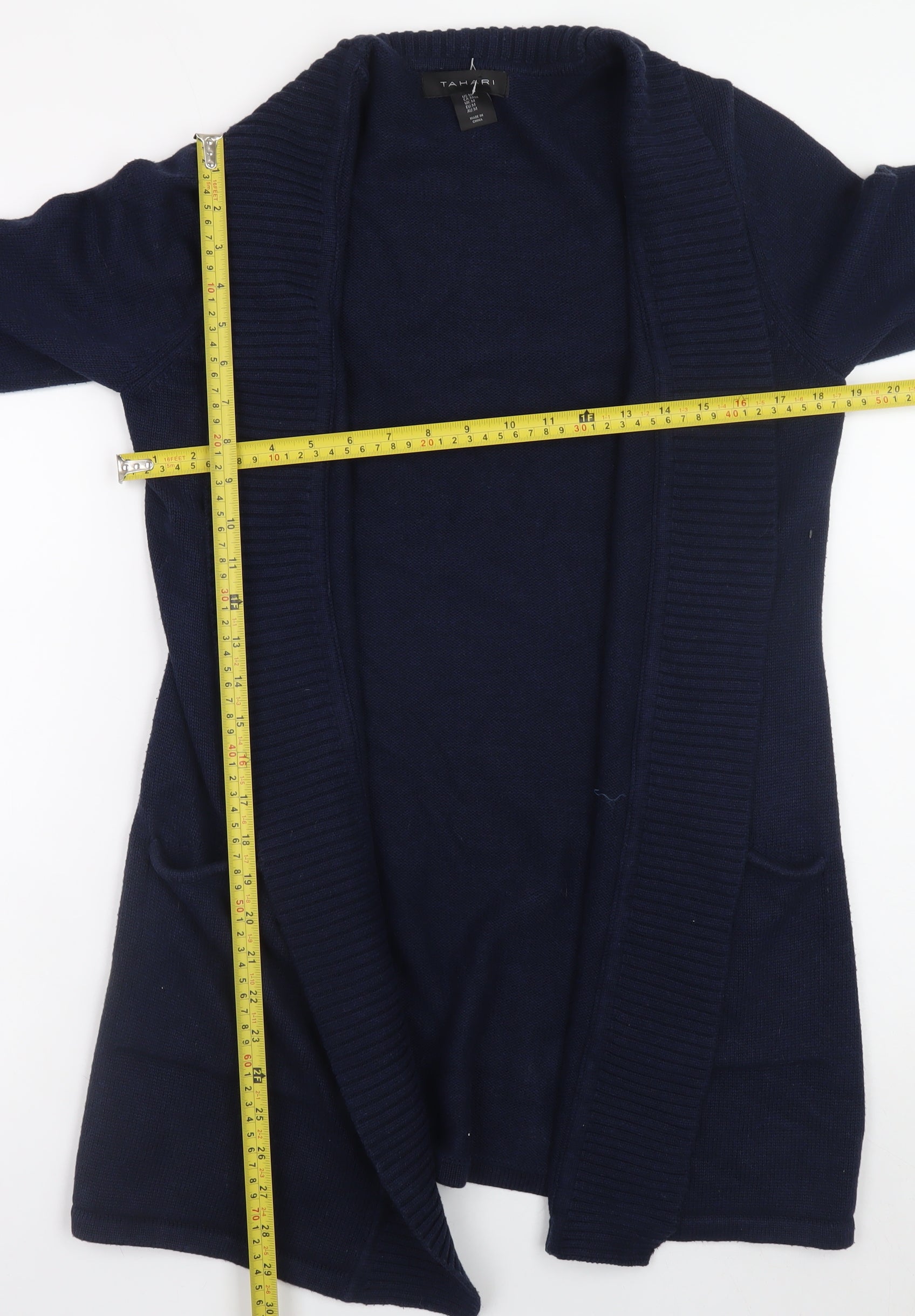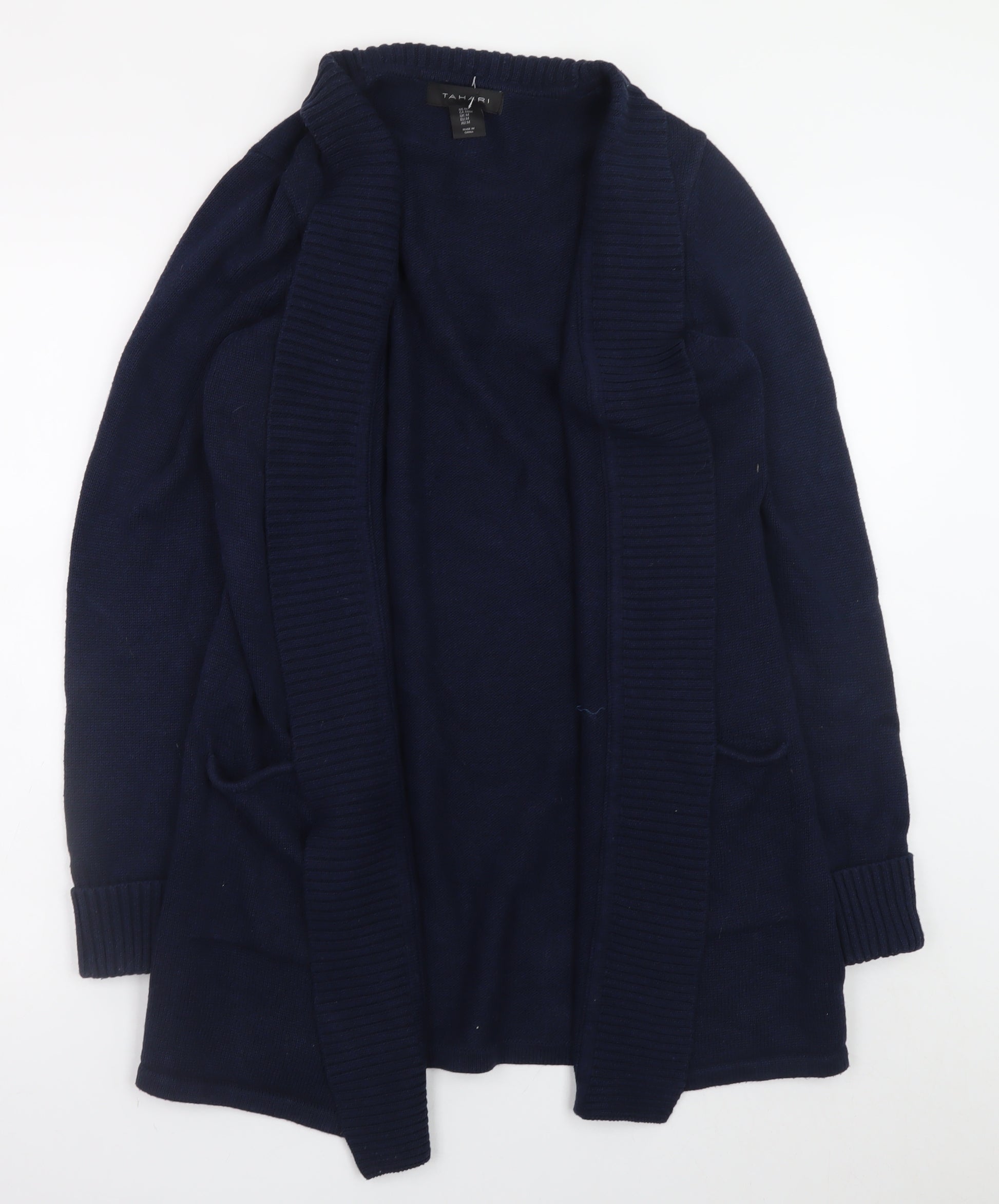 This elegant Tahari Women's Navy Blue Cardigan Jumper is the perfect layering staple for cooler days or breezy evenings. Crafted from a soft and breathable 60% cotton and 40% polyester blend, this cardigan offers a lightweight yet cozy feel. Designed with an open-front style, it provides both comfort and effortless sophistication, making it easy to pair with trousers, skirts, or jeans for a versatile everyday look. The ribbed trim on the collar, cuffs, and hem enhances its structure, while the deep navy colour delivers a timeless appeal suitable for smart-casual and relaxed outfits alike. The cardigan features long sleeves and convenient side pockets, ideal for keeping hands warm or carrying small essentials. Its finely knitted fabric ensures a soft touch against the skin and helps retain warmth without feeling bulky. With its simple yet refined design, this piece transitions seamlessly from workwear to weekend wear. Whether thrown over a blouse for the office or layered with a t-shirt for off-duty days, it elevates your outfit with understated elegance. Perfect for autumn, spring, and winter, this cardigan stands out for its balance of practicality and modern style. Maintained in excellent pre-owned condition with no visible marks or pulls, it remains in superb shape and ready to wear. Ideal for the woman who values quality, comfort, and timeless fashion, this Tahari cardigan delivers a touch of sophistication to any wardrobe. Comfortable, easy-care, and endlessly wearable, it's a must-have staple you'll reach for time and again.