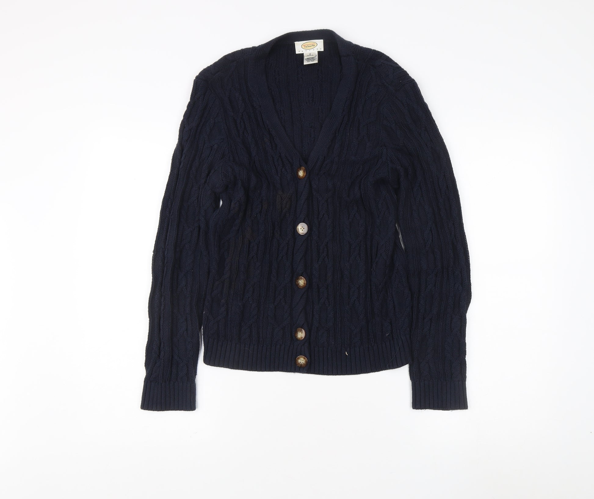 Elevate your wardrobe with this classic blue cable-knit cardigan from Talbots, designed for a timeless addition to your autumn and winter collection. Crafted from 100% cotton, this cardigan offers a breathable yet comforting touch, ideal for keeping warm during the colder months. The V-neck design flatters any neckline and makes layering simple, whether you're wearing it over a crisp blouse or relaxing in a t-shirt. With its easy button accents and a rich blue tone, this cardigan pairs seamlessly with casual or business-casual outfits.Designed in a snug yet comfortable fit, the long sleeves are perfect for added warmth, making it a must-have for any style-conscious woman's wardrobe. Its petite size makes it a great choice for those looking for a well-proportioned fit, ensuring comfort and style go hand in hand. This versatile cardigan, with its classic, no-pattern design, can transition between casual outings and more formal settings with ease. Machine washable for convenience, it's as easy to care for as it is to wear, without sacrificing any of its classic appeal.Whether heading to the office or enjoying a leisurely day out, the Talbots cable-knit cardigan remains a key piece that offers both style and functionality. Add this timeless piece to your collection and enjoy the perfect blend of comfort, style, and practicality that only Talbots can provide. Experience the elegance and practicality of this blue beauty and make it a staple in your seasonal wardrobe.