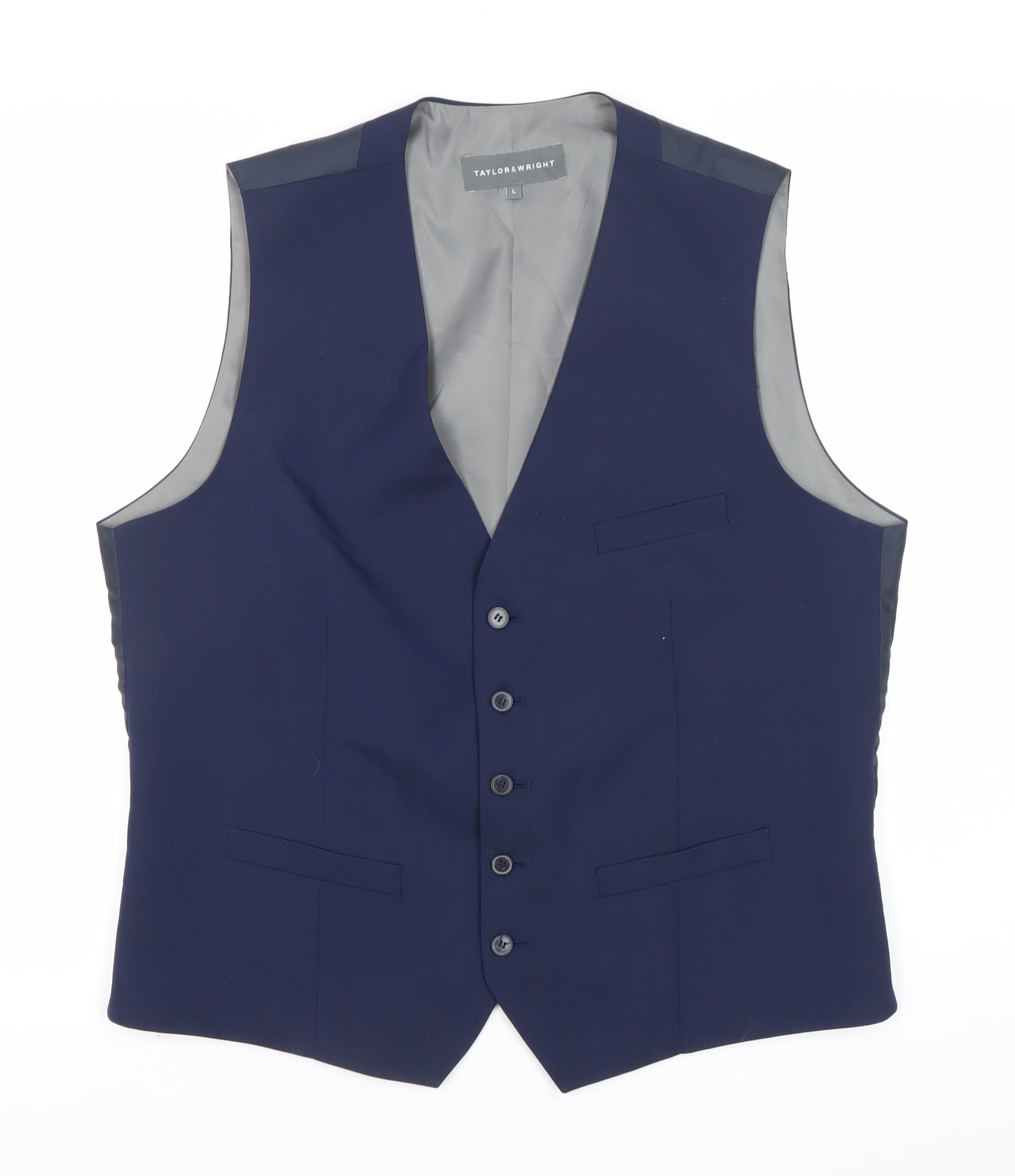 This Taylor & Wright men’s suit waistcoat offers a sophisticated and elegant addition to your formalwear wardrobe. Crafted in a refined navy blue shade, this waistcoat is designed for versatile styling – ideal for weddings, business occasions, or any formal gathering where polished presentation is essential. The waistcoat is labelled in size Large, aligning with a regular UK fit for men, ensuring both comfort and a flattering silhouette. Tailored with a sharp V-neckline and a classic five-button front, it brings sleek structure to your outfit while enhancing the profile of your suit when paired with a matching jacket or trousers. Made from a high-quality blend of 55% polyester and 45% wool, it balances durability with breathable comfort, ensuring lasting wear that maintains its sharp look across occasions. The lining is constructed from 100% polyester, delivering a smooth inner feel. The adjustable back strap enhances fit precision, ensuring the waistcoat contours comfortably to different body shapes. The simple navy blue plain design with no additional patterns makes this a timeless staple that easily complements a wide selection of shirts, ties, and suits. Suitable for business meetings, weddings, parties, or formal dinners, this piece guarantees versatility and refined elegance. Overall condition is set to Excellent, with no visible defects besides light creasing from storage. Offering remarkable value for those looking to upgrade their formalwear essentials, this waistcoat combines classic tailoring with practicality. A timeless addition to any wardrobe, perfect for both single-event sophistication and regular rotation in professional or celebratory settings.
