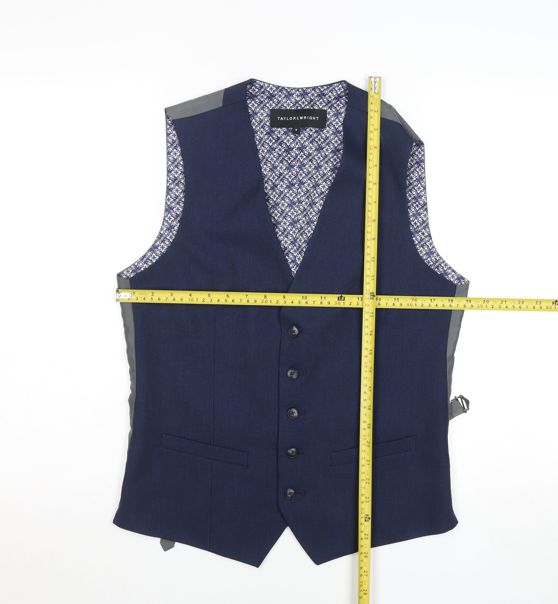 Elevate your formalwear collection with this sophisticated Taylor & Wright men's waistcoat, crafted in a timeless navy blue shade ideal for business, special occasions, or smart everyday wear. Designed in a classic fit, this waistcoat combines traditional tailoring with contemporary flair, featuring a sleek five-button front closure, adjustable buckle strap at the back for a refined silhouette, and an elegant shawl-style neckline. The luxurious blue outer, made from quality polyester twill, offers durability and shape retention, while the contrasting patterned lining adds a touch of character and inside comfort. Suitable for year-round wear, this versatile waistcoat can be seamlessly paired with a matching blazer or trousers for a polished three-piece look. Finished with twin front welt pockets, it's perfect for both weddings and professional environments. The condition remains excellent, showing only the lightest signs of careful previous use and no visible defects, ensuring it looks sharp and feels comfortable. Easy to care for, it's machine washable, making it both stylish and practical for the modern gentleman. Whether you're attending a formal dinner, important meeting, or celebratory event, this piece delivers a smart impression every time. A dependable wardrobe staple from Taylor & Wright that embodies quality craftsmanship and timeless British tailoring, this waistcoat makes an excellent choice for elevating any outfit with classic sophistication.