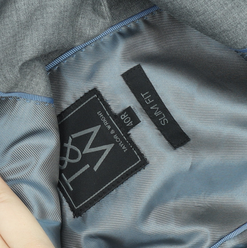 This refined Taylor & Wright men's slim fit blazer offers a timelessly polished look perfect for both business and formal occasions. Crafted from a high-quality polyester and viscose blend, the fabric ensures a smart drape and comfortable wear throughout the day. The grey tone provides a versatile base that can be paired with a variety of shirts and trousers to create stylish ensembles suitable for the office, weddings, or evening events. Designed in a slim fit cut, this blazer adds a tailored silhouette that complements modern tastes while retaining a classic aesthetic. The jacket features a generous 40-inch chest and a regular length, offering a sharp yet comfortable profile ideal for most builds. Detailing includes a notch lapel, two-button front fastening, and a neatly structured single-breasted finish enhanced by a subtle texture that lends refined sophistication. Thoughtful finishing touches include three-button cuffs, a single back vent for flexible movement, and multiple inner pockets for practicality and convenience. The interior showcases a smooth polyester and viscose lining that adds a touch of luxury to its design. This blazer can be styled effortlessly with matching T&W trousers or worn as a sport coat over chinos or jeans for a relaxed smart-casual look. Suitable for all seasons, it transitions smoothly between workdays and special occasions. In excellent pre-owned condition with minimal signs of wear, it has been well cared for and retains its original shape and colour. A reliable and stylish essential, this Taylor & Wright grey slim fit blazer is an adaptable wardrobe staple, offering professional poise and sophistication in every setting — perfect for the confident, modern gentleman seeking effortless smart style.