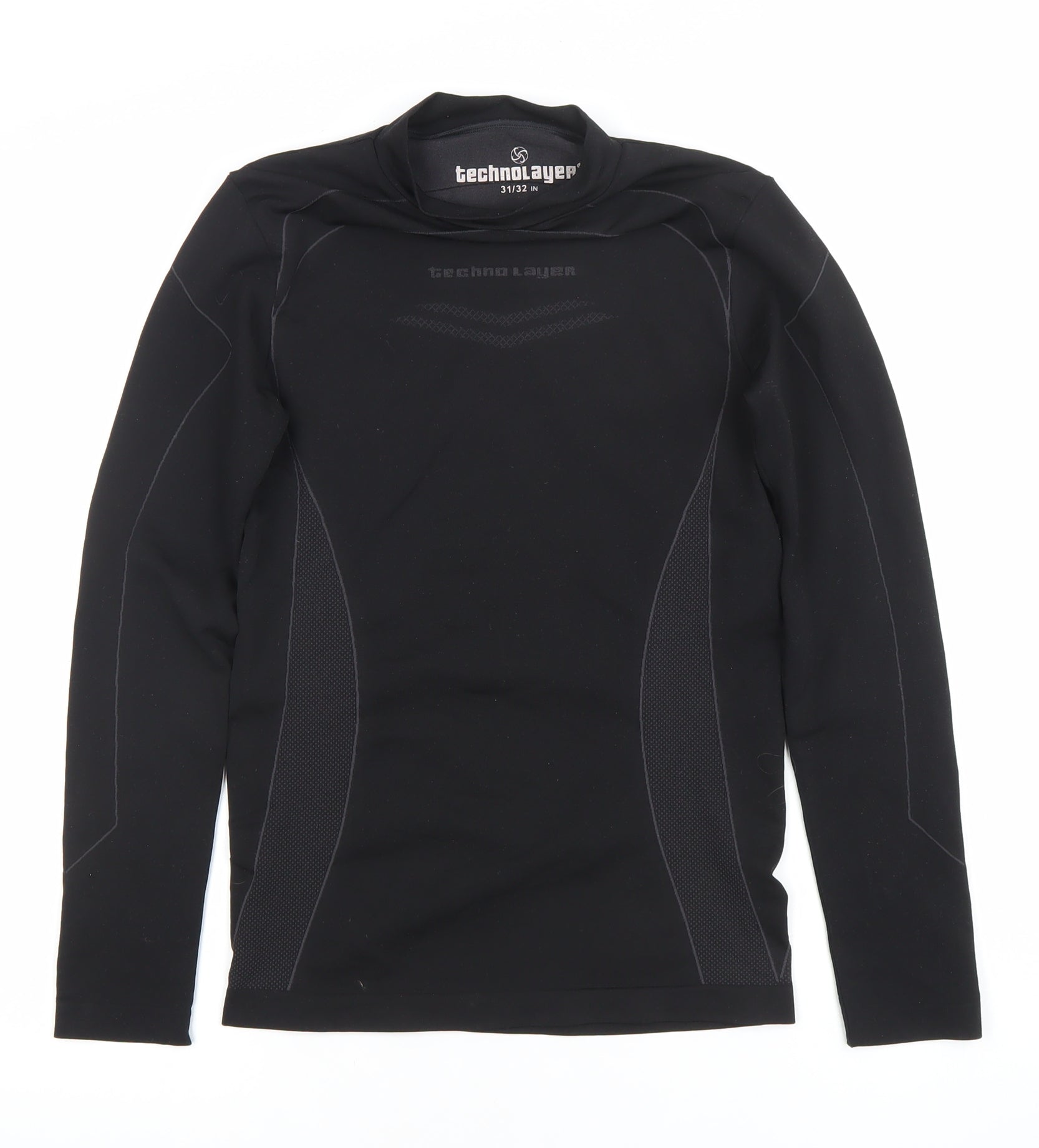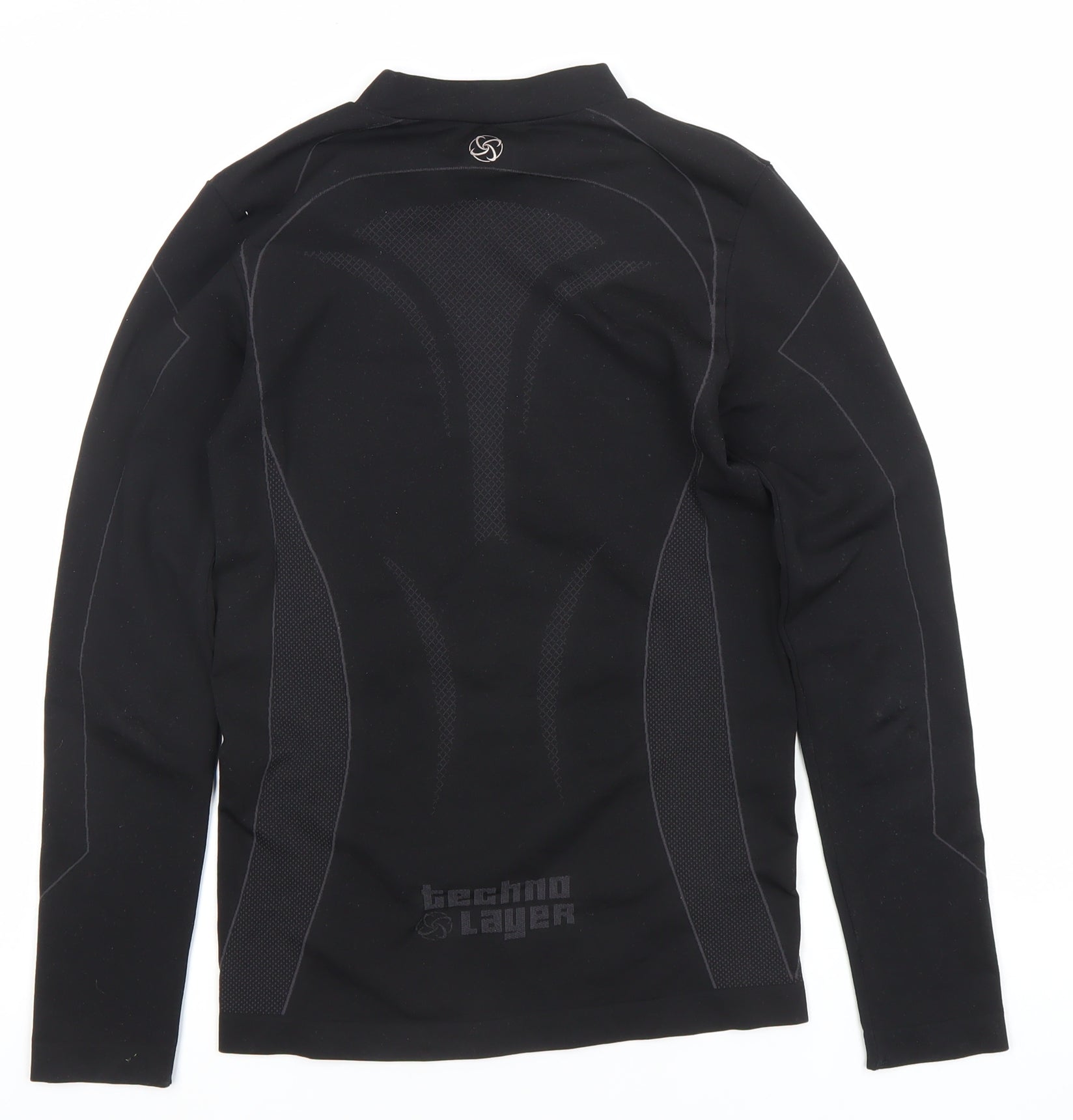 This Techno Layer women's black long sleeve base layer top is designed for superior comfort and performance during active workouts or colder weather training sessions. Cut from a stretchable knit fabric blend of polyamide, polyester, and elastane, it offers a streamlined athletic fit that supports your movements while providing exceptional breathability and moisture-wicking properties. The lightweight yet insulating construction helps keep your body temperature regulated whether you're jogging outdoors, hitting the gym, or practicing yoga. Featuring a crew neckline and raglan-style sleeves for enhanced freedom of movement, this pullover top delivers both practicality and modern appeal. Its sleek black design with subtle panel detailing ensures a flattering silhouette that complements any sportswear outfit, while the advanced Techno Layer fabric technology makes it ideal for layering under activewear or wearing on its own. Durable and comfortable against the skin, this essential performance piece washes easily and retains its shape after repeated use. Perfect for running, training, crossfit, or general workouts across spring, autumn, or winter seasons, this versatile activewear top blends function with minimalist style, making it a must-have addition to any fitness wardrobe. Condition is excellent with only light signs of wear and no visible flaws.