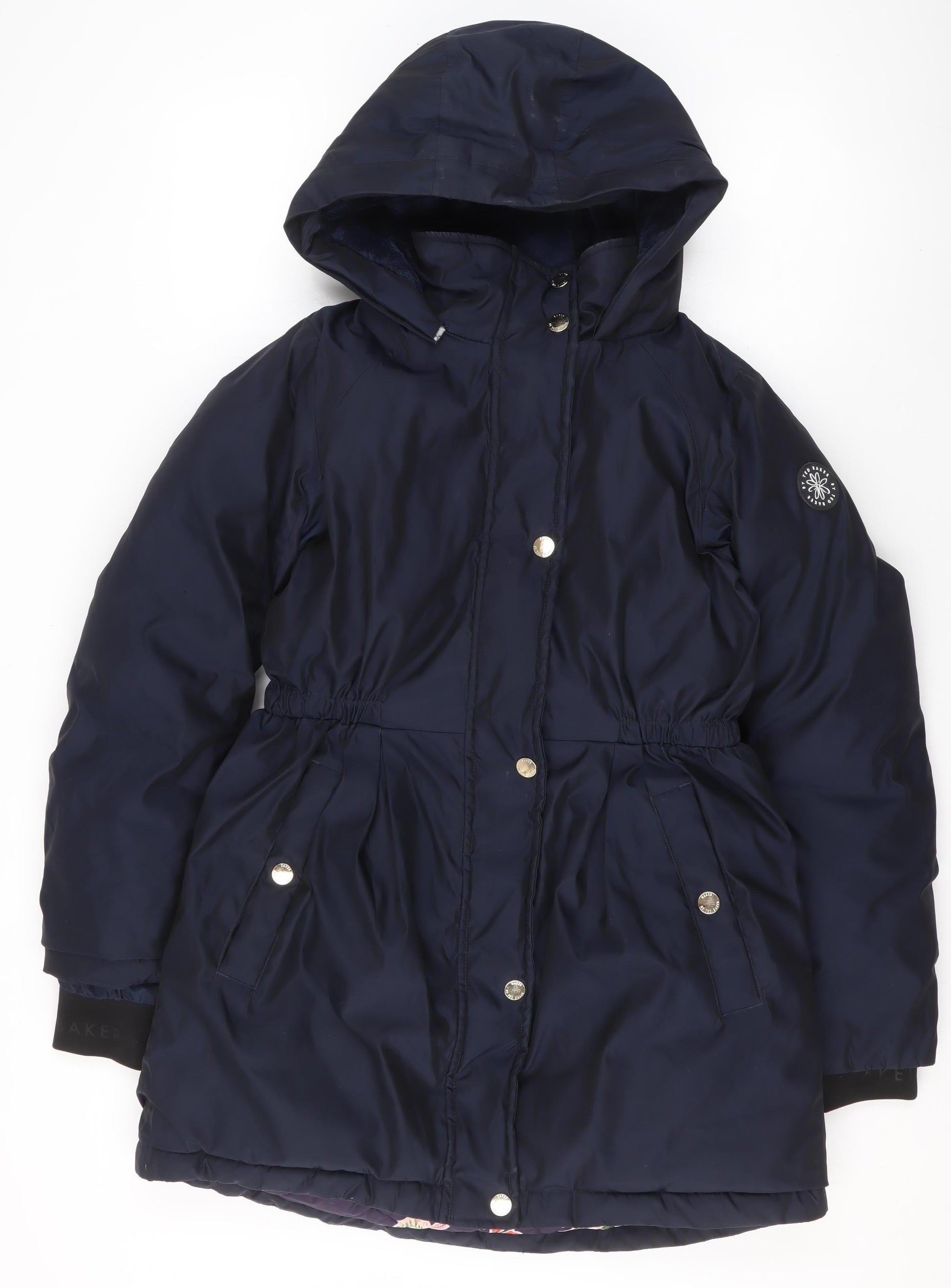 Keep your little one stylish and cosy through the cold months with this charming Ted Baker Girls blue hooded puffer coat, designed for age 12 years. Crafted from 100% polyester, this mid-length winter coat offers both comfort and durability, ensuring it can handle daily wear while maintaining its elegant appeal. The navy blue outer shell is sleek and classic, accented with reflective piping and the signature BAKER logo across the back for a premium designer touch. The interior is fully lined with soft polyester, providing added warmth for chilly winter days. With its padded structure and practical hood, it’s perfect for school mornings, weekend outings, or active adventures outdoors. The zip and snap front closure ensure a secure fit, while the waist has light elastic shaping for a comfortable tailored feel. Functional details such as zipped and snap pockets make it convenient for carrying small essentials. This stylish jacket captures the perfect balance between fashion and function, embodying the distinct Ted Baker aesthetic—refined yet playful. The coat remains in very good used condition, showing only minor scuff marks on the back that do not affect its overall look or use. Machine washable for easy care, it’s ideal for children and parents seeking a durable and practical winter essential with designer flair. A fantastic choice for casual winter wear, this Ted Baker puffer coat delivers quality, warmth, and style all in one. Available at an excellent value, this coat is set to become a wardrobe favourite, keeping your child warm, comfortable, and effortlessly fashionable throughout the season.