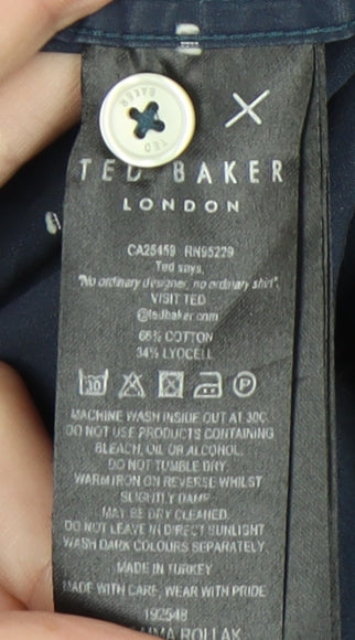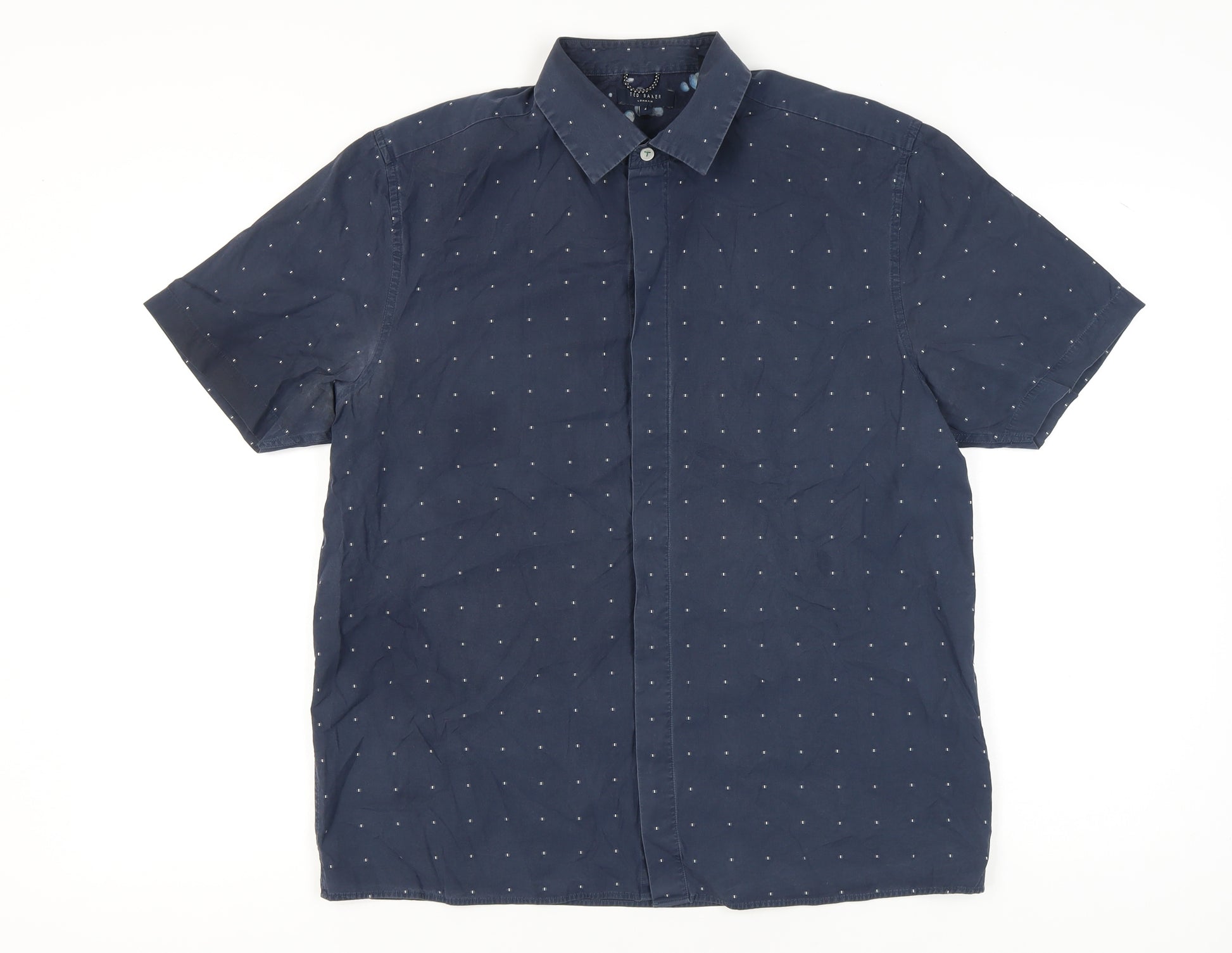 Elevate your casual wardrobe with this refined Ted Baker men’s short sleeve button-up shirt, crafted with the brand’s signature attention to style and detail. Designed in a versatile navy blue with a subtle polka dot pattern, this shirt offers a classic yet modern look that seamlessly adapts to a variety of occasions. Whether you're dressing for a relaxed weekend outing, a casual day at the office, or an evening out, it delivers effortless sophistication in lightweight comfort. Made from a premium blend of 66% cotton and 34% lyocell, the fabric feels soft against the skin while remaining breathable, making it a reliable choice for Spring and Summer wear. The woven fabric further enhances durability while maintaining a smooth texture. Its collared neckline with a point collar gives it a polished finish, complemented by a full button-up front closure. Lightweight and breathable, this shirt ensures comfort in warmer weather while retaining Ted Baker’s dedication to quality finish.The shirt is cut in a regular fit, with short sleeves for a relaxed and easy-going wear, perfectly suited for casual and travel occasions. The button accents add a clean finish, while the understated pattern makes it easily matchable with chinos, jeans, or smart shorts. With its versatile styling, it can be dressed up with a blazer or worn simply on its own for an effortlessly stylish look.This shirt is in very good condition, showing only light signs of previous wear, with some slight creasing that is easily resolved with care. Machine washable for practicality, this shirt is as easy to maintain as it is stylish to wear. With Ted Baker’s reputation for contemporary design and quality fabrics, this piece is a wardrobe essential for any man looking to strike the perfect balance between relaxed and refined fashion.A timeless Ted Baker piece that brings understated pattern and breathable comfort to your casual rotation, ready to keep you cool and stylish through the warmer months.