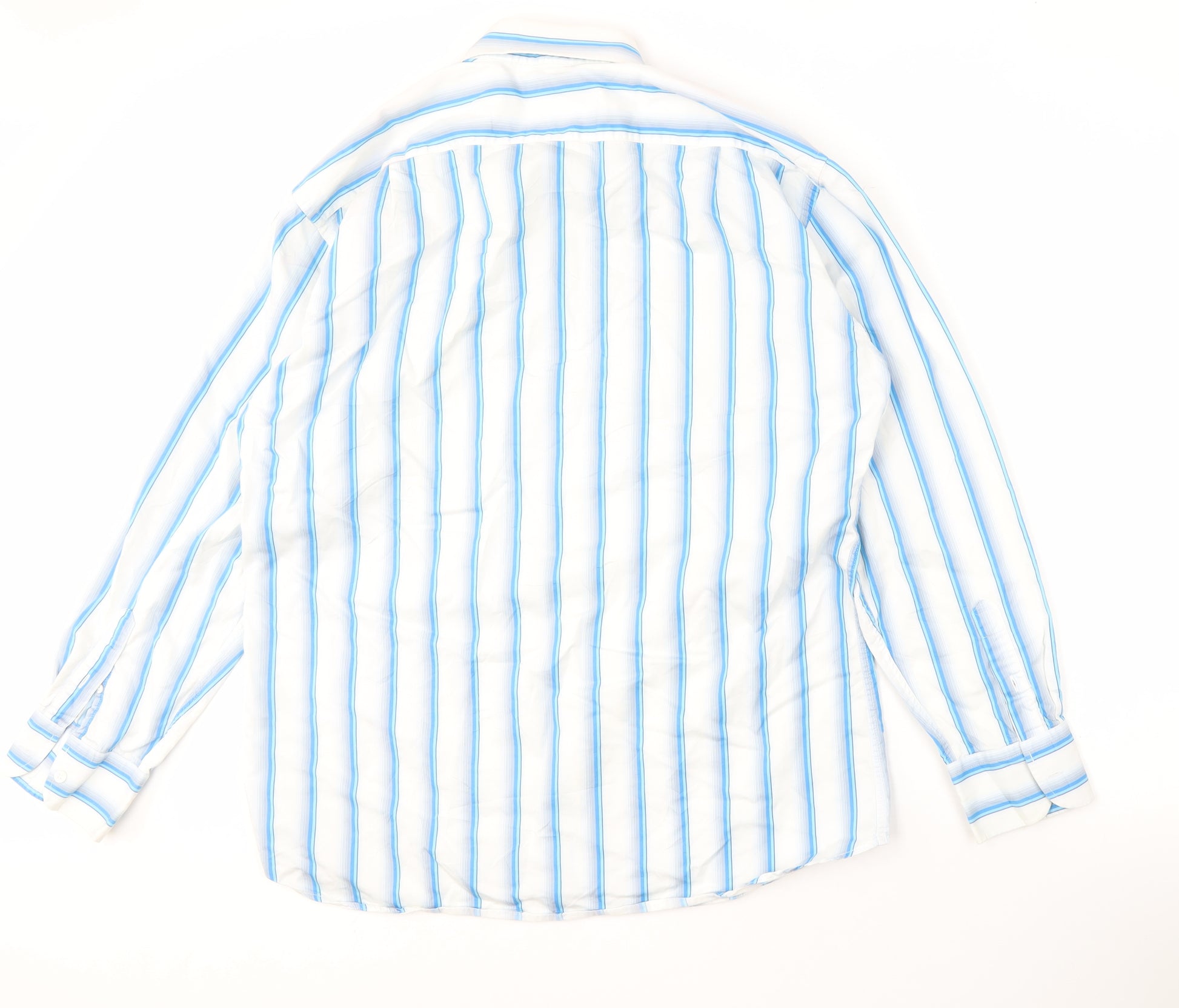 Elevate your wardrobe with this classic Ted Baker men’s shirt, perfect for any casual occasion. Designed with an elegant blue striped pattern, this button-up shirt offers a refined yet laid-back style suitable for every man's closet. Crafted from 100% cotton, this shirt ensures comfort and breathability, making it ideal for all-day wear. The long sleeves and collared neckline add a touch of sophistication, while the point collar style enhances its clean look. Secure with a button closure, this Ted Baker shirt promises easy wear and a sleek appearance. In excellent condition with only minor creasing observed, it’s ready to enhance your casual outings. Whether you pair it with jeans or chinos, this shirt is a versatile addition to your attire. Defined by its high-quality fabric and stylish design, the Ted Baker shirt is machine washable, offering ease of care. An ideal choice for those who appreciate comfort and style, it stands as a testimony to Ted Baker’s commitment to quality and fashionable men’s clothing.