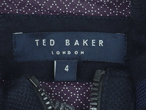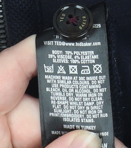 Add timeless sophistication to your wardrobe with this Ted Baker men's bomber jacket in classic black. Designed with a modern silhouette and stand-up collar, it combines casual elegance with comfort. Crafted from a premium fabric blend of polyester, viscose, elastane, and cotton, this jacket provides both structure and flexibility, offering a sleek profile perfect for layering across seasons. The full zip front and clean, minimalistic design give it a refined look, while zipped and side pockets add practicality and a touch of sporty appeal. The interior is lightly lined for comfort, making it suitable for transitional weather in autumn and spring. The Ted Baker logo detailing and high-quality finish ensure this piece carries the brand’s signature attention to craftsmanship and style. Ideal for casual outings, travel, or smart-casual events, this versatile jacket pairs effortlessly with jeans, chinos, or tailored trousers. Made in Turkey and machine washable, it is easy to care for, ensuring both durability and long-lasting style. In excellent pre-owned condition with only slight lint from normal wear, it represents impeccable quality at a great value for any wardrobe upgrade.