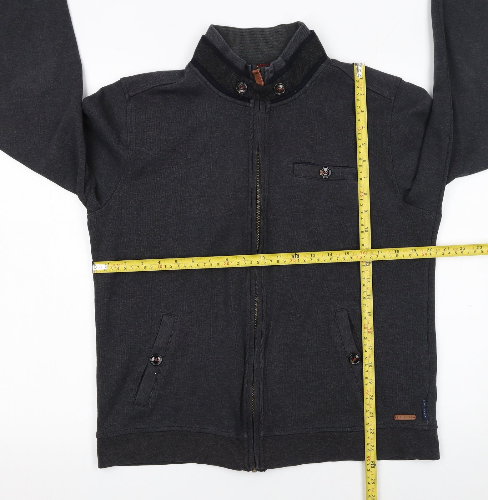 Step out in timeless sophistication with this Ted Baker men’s black full zip sweatshirt, a perfect layering essential that brings refined casual style to your wardrobe. Made from a premium blend of 75% cotton and 25% polyester, this sweatshirt offers a soft and comfortable jersey feel while retaining durability and shape through everyday wear. The high neck design with button accents adds a touch of suave tailoring, ideal for those cooler days when a hoodie feels too casual but a jacket feels too formal. Designed for a regular fit, it strikes the perfect balance between comfort and style, making it suitable for both relaxed weekends and smart-casual outings. The front features a full zip closure for convenience, complemented by buttoned side pockets and an additional buttoned chest pocket that reflect the brand’s thoughtful attention to detail. Subtle Ted Baker branding on the pocket tab adds polish without distraction. Its versatile plain black colour ensures effortless pairing with jeans, chinos, or joggers, transitioning seamlessly from day to night. The lightweight cotton-rich fabric ensures breathability and ease of movement, while the inner lining enhances comfort. Suitable for autumn, spring and winter wear, this sweatshirt works well layered under coats or worn solo with a tee beneath. Keeping it fresh is simple – it’s fully machine washable, easy to care for, and built to last. In excellent used condition with only minimal signs of wear and no visible flaws, this piece offers style and quality synonymous with Ted Baker design at a fantastic pre-owned value. Perfect for men who appreciate understated elegance and comfort in one. Add this Ted Baker black sweatshirt to your wardrobe for a polished yet laid-back style that’s ready for any casual-smart occasion.