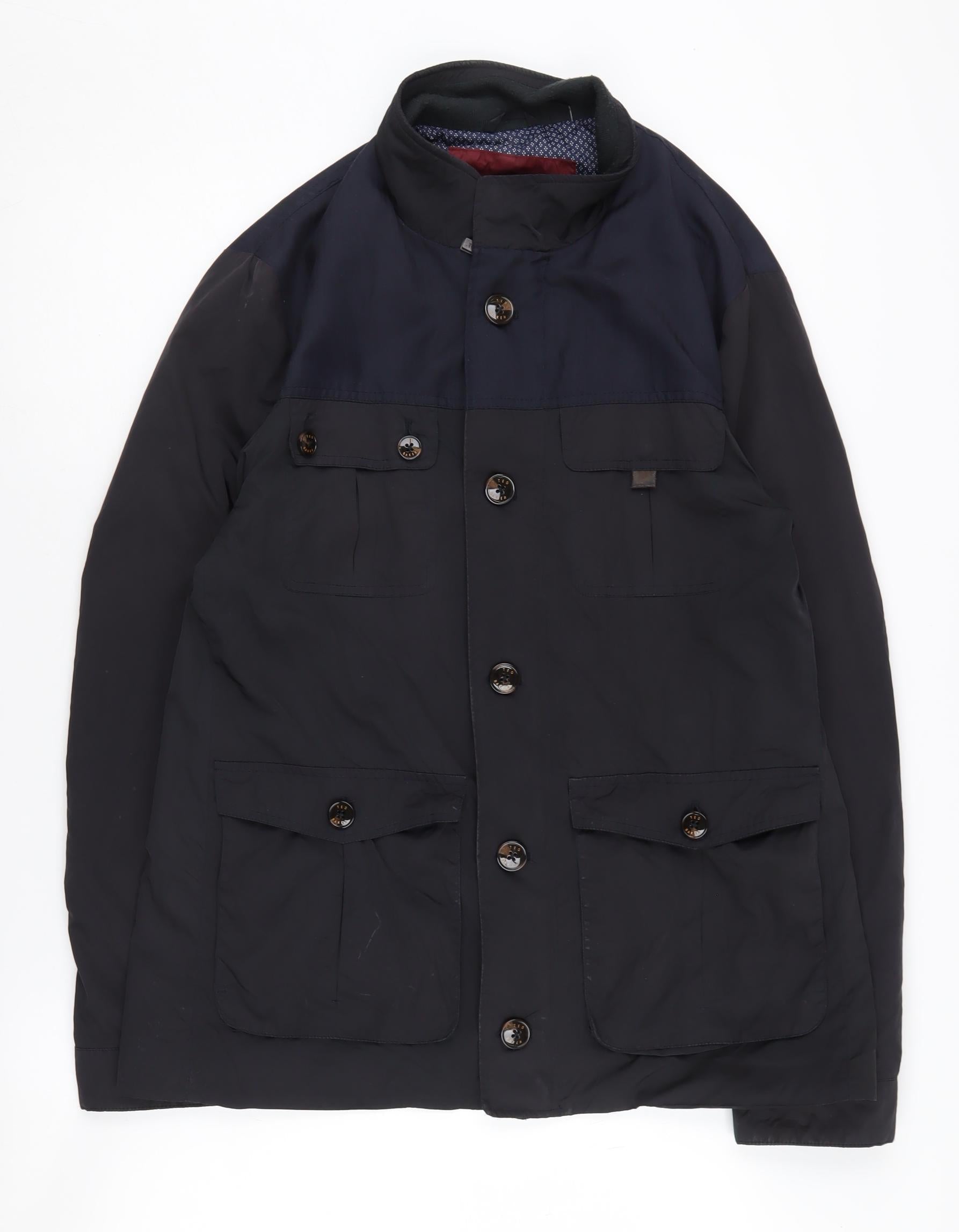 Upgrade your outerwear collection with this Ted Baker Military Jacket for men, designed in a sleek black colour that pairs effortlessly with any ensemble. This regular fit jacket is crafted from a robust blend of 75% polyester and 25% polyamide, ensuring durability and comfort against the elements. The jacket features a stand-up collar and button closure, exuding a modern military style that is perfect for both casual autumn and winter outings. Equipped with practical buttoned pockets, this jacket combines functionality with fashion, making it an ideal choice for everyday wear. Despite minor wear on the pockets, the jacket remains in excellent condition, ready to complement your wardrobe. Machine washable for easy maintenance, its versatile design is perfect for various occasions, from running errands to more formal social events. Embrace the iconic Ted Baker craftsmanship and style with this mid-length jacket, a staple piece that promises warmth and timeless appeal throughout the colder seasons.