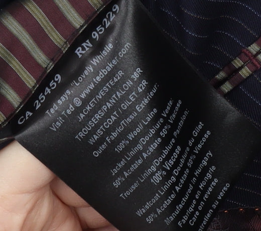 Elevate your wardrobe with this sophisticated Ted Baker men's suit jacket, tailored for those who appreciate both style and quality. The jacket is crafted from 100% wool, offering a luxurious feel that promises to keep you comfortable while maintaining a polished appearance. This elegant piece comes in a rich blue hue with a classic striped pattern, embodying the perfect blend of modern flair and timeless design. The jacket features a traditional single-breasted cut, complete with a notch lapel and a two-button front, making it an excellent choice for business meetings or formal occasions. Its regular fit and 42R size ensure a flattering silhouette that complements a variety of body types. The red acetate and viscose lining adds an unexpected pop of colour, highlighting Ted Baker's attention to detail and craftsmanship. This jacket is suitable for the autumn and winter seasons, providing warmth without compromising on style. It showcases a single-vented back for added mobility and comfort, while the three-button sleeve adds a refined finishing touch. With dry clean only care instructions, you can preserve its pristine condition effortlessly. Perfect for men seeking a versatile yet distinctive suit jacket, this piece is ideal for office wear or evening events. Make a statement with Ted Baker's exceptional design, ensuring you stand out with elegance and class at any occasion.