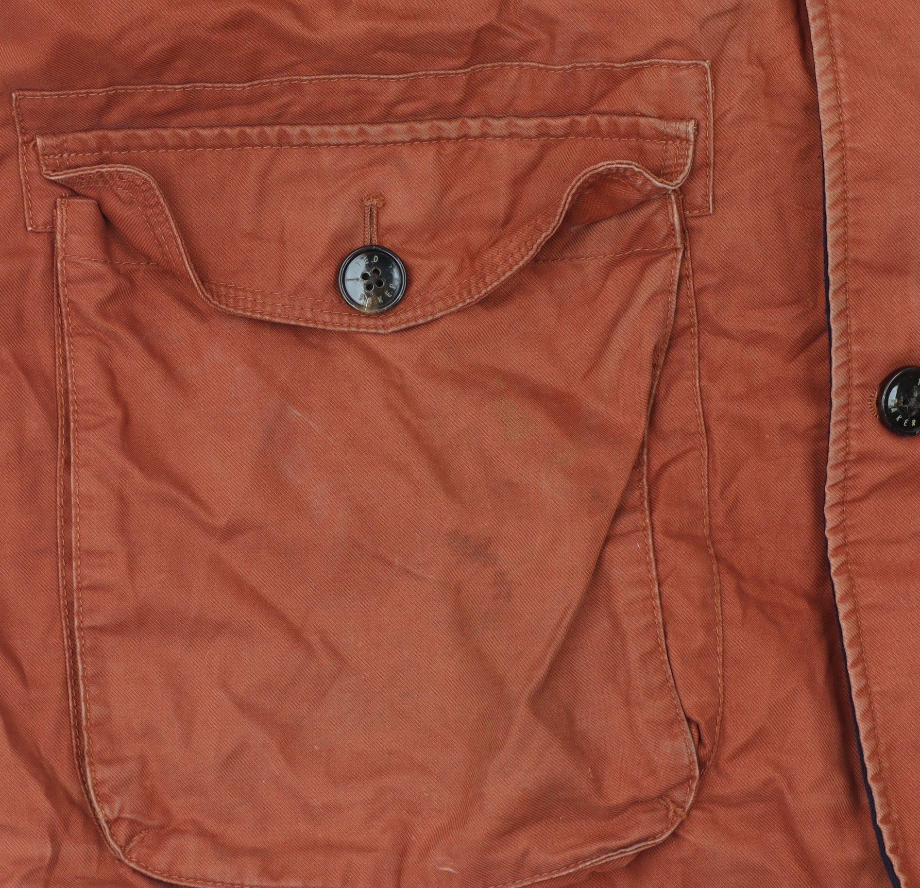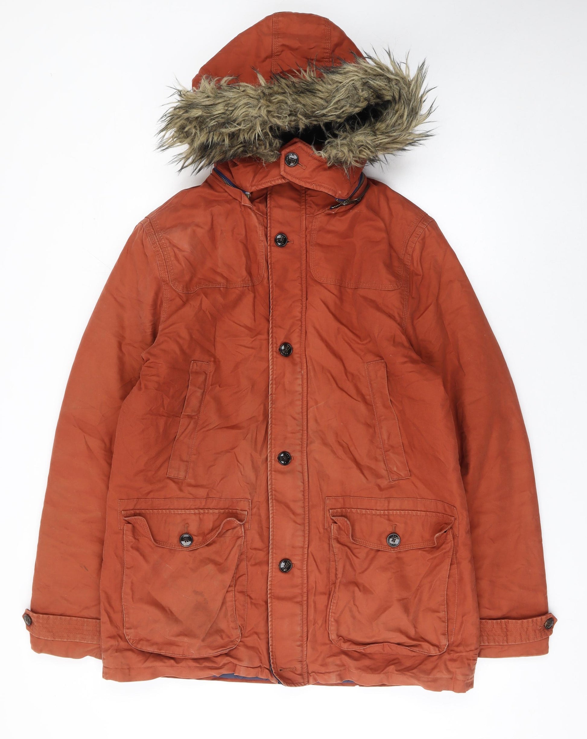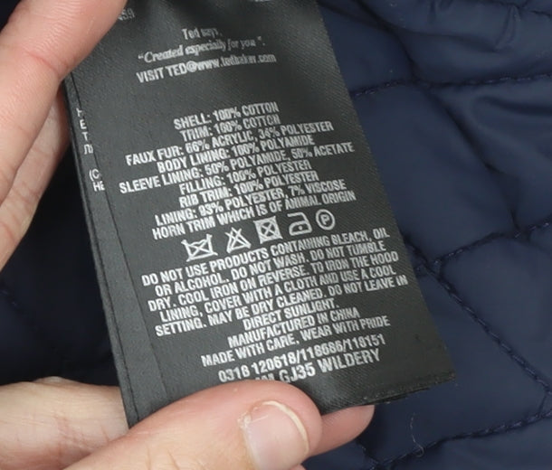 Stay effortlessly stylish and prepared for the colder months with this Ted Baker Men's Hooded Cotton Parka Coat. Crafted from 100% cotton for a soft yet durable outer shell, this mid-length brown coat blends functionality and sophistication. The design includes a comfortable faux fur-trimmed hood providing added warmth and a touch of luxury, while the quilted navy lining ensures insulation and comfort throughout winter. This parka features both button and zip closure for excellent wind protection, as well as multiple front pockets designed for practicality. The combination of the button-down flap pockets and inner compartments provides secure and easy access storage, perfect for daily wear. With rib trims and a stand-up collar, the coat offers a refined and structured fit that maintains warmth while maintaining an effortlessly urban finish. The inner lining combines polyamide, acetate, polyester and viscose for an improved soft, breathable touch. Ideal for everyday winter wear, this Ted Baker coat pairs perfectly with jeans and boots for casual urban styling, while offering sufficient protection for outdoor activities. Cut in a regular fit and finished in a rich brown tone, this refined Ted Baker parka emphasises modern British craftsmanship. The coat’s sleek, practical design ensures it transitions smoothly from day-to-day commuting to relaxed weekend outings. Condition is rated Very Good, showing light wear and minor marks typical of gentle use without compromising appearance or comfort. Its high-quality construction and luxury detail mean it will remain a staple in your wardrobe for many seasons. Perfect for those seeking a versatile and timeless winter coat that offers both durability and understated style.