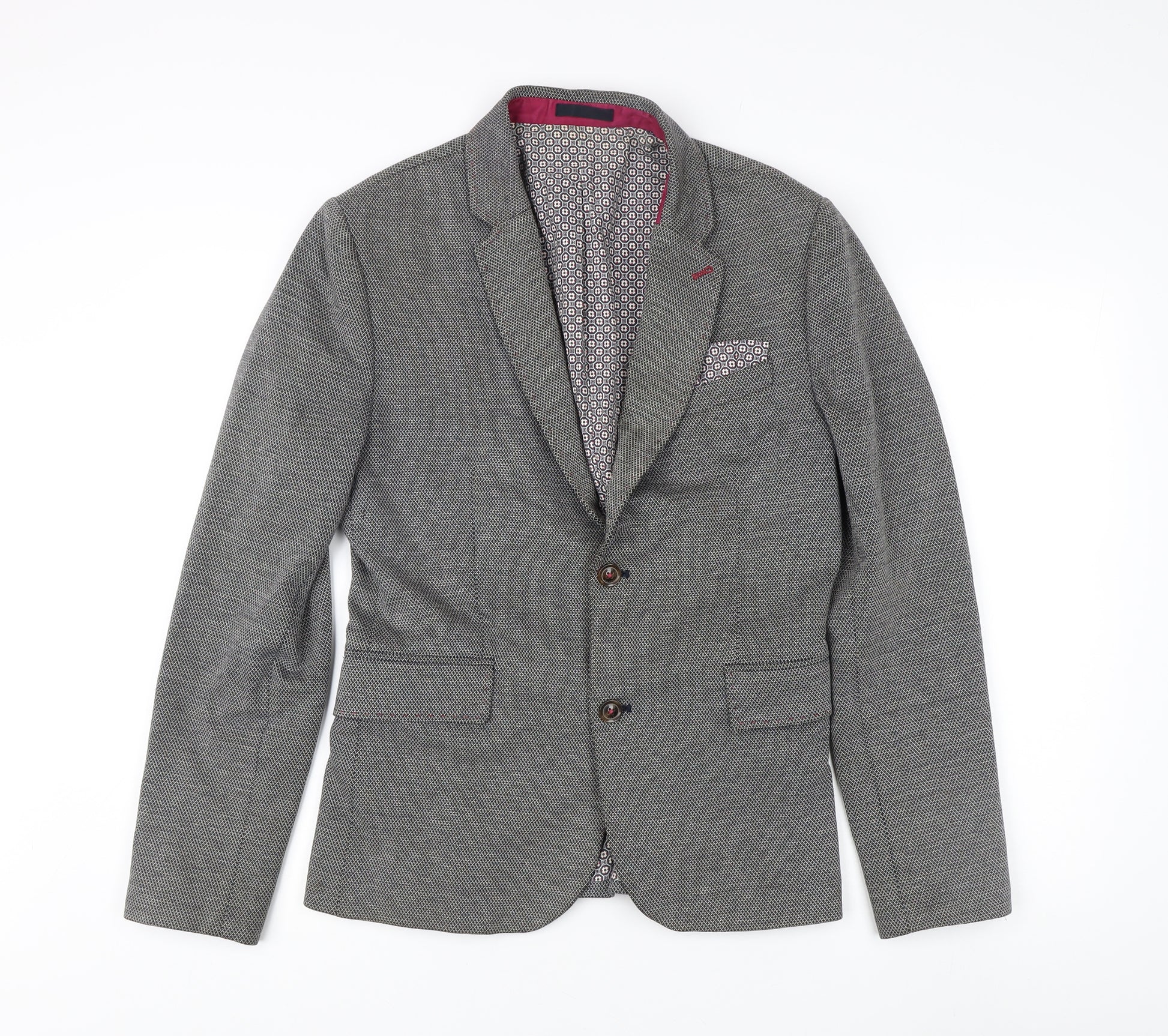 Elevate your wardrobe with this Ted Baker men's blazer, a perfect addition for both business and casual settings. Expertly crafted in a sophisticated grey hue, this slim fit blazer showcases a distinguished tweed fabric, ensuring comfort and style. Featuring a classic herringbone pattern, it pairs well with a variety of outfits, making it a versatile piece for your collection. Designed with a meticulous attention to detail, this blazer offers a single-breasted cut with a notch lapel, lending a modern yet timeless appeal. The two-button front and double-vented back enhance mobility and fit, providing a flattering silhouette. Its polyester lining ensures a soft feel against the skin, while the blazer's cotton-polyester blend not only enhances durability but also provides a refined look. Ideal for autumn and spring, this blazer includes four-button sleeves and convenient inner pockets, allowing you to carry essentials with ease. Whether at a business meeting or a casual outing, this Ted Baker blazer will add a sophisticated touch to your attire. Dry clean only to maintain its pristine condition. Minimal wear visible, priced at an attractive £75.00. Grab this opportunity to own a classic piece from Ted Baker, sure to impress and remain in style for seasons to come.