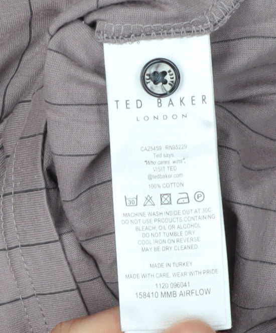 Upgrade your casual wardrobe with this stylish Ted Baker Men's Polo Shirt. Bearing the distinctive striped pattern in a subtle purple tone, this shirt is perfect for adding a touch of sophistication to your everyday look. Crafted from 100% cotton jersey fabric, it ensures maximum comfort and breathability, making it suitable for warmer seasons. The collared neckline and short sleeves add a classic touch, while the button accents provide functional style. In excellent condition, this piece shows minimal signs of wear and will easily become a staple in your collection. Ideal for casual outings or relaxed office days, this shirt brings a refined edge to any outfit. Ted Baker's commitment to quality ensures longevity, making this a worthwhile addition to your wardrobe. Don't miss out on owning a versatile piece that's both comfortable and fashionable.
