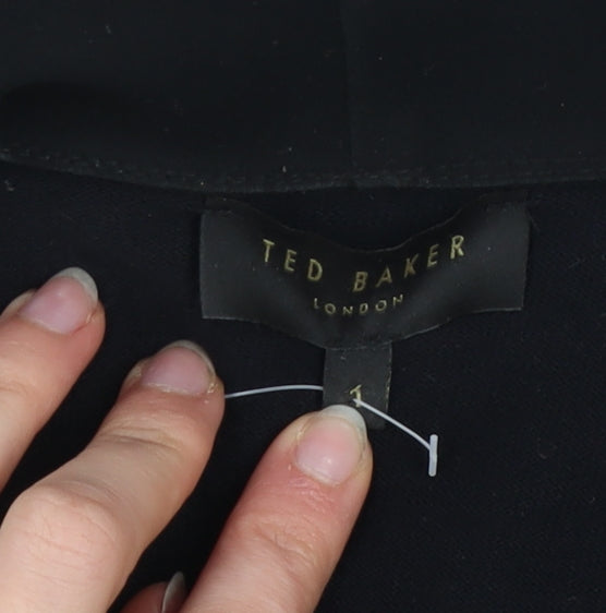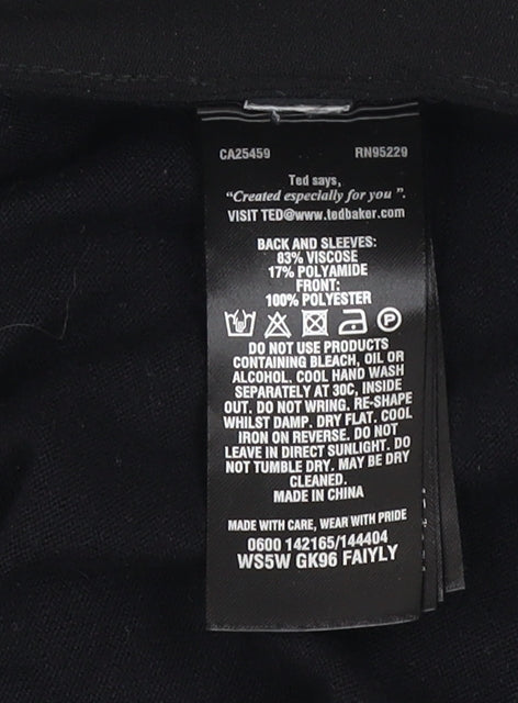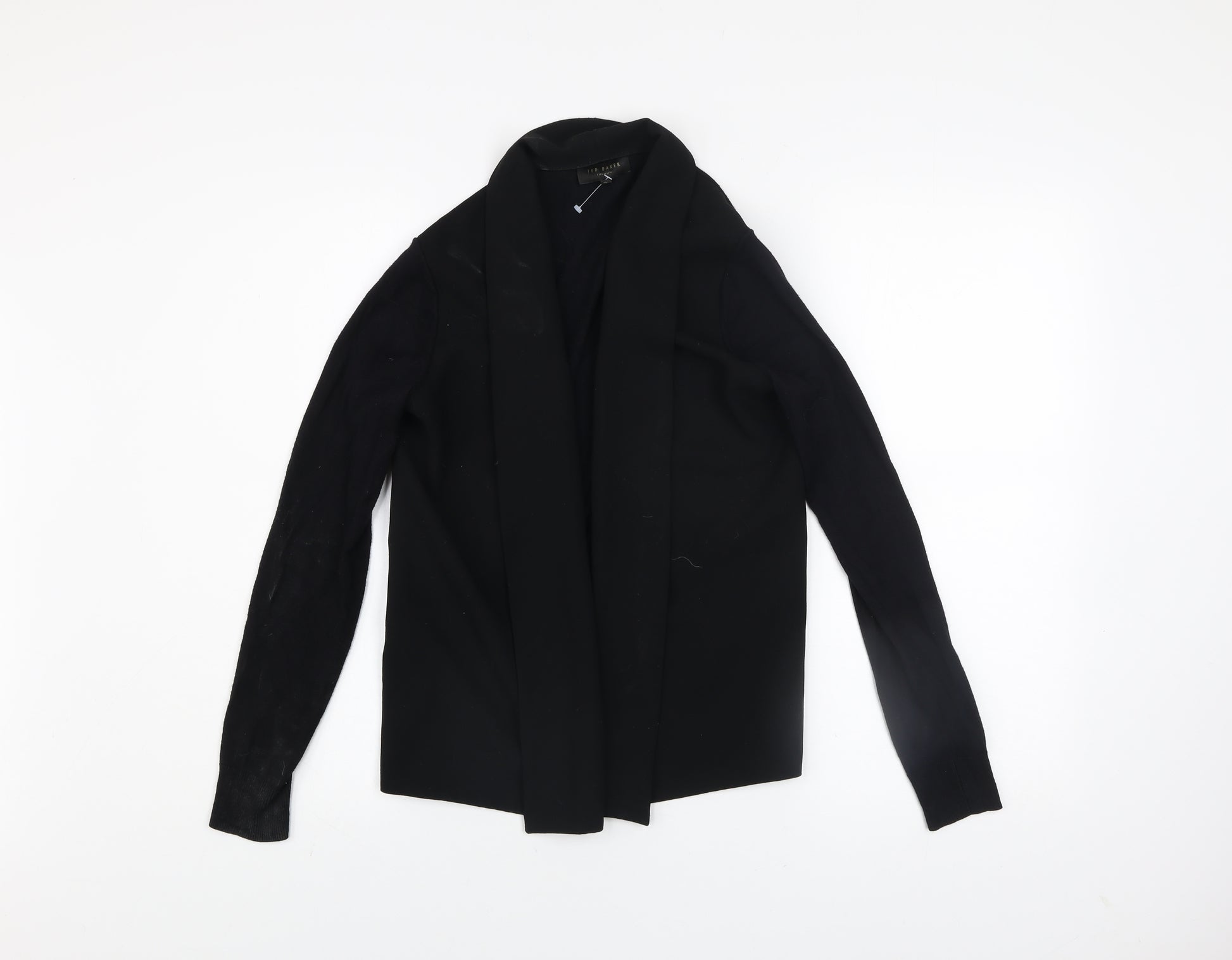 This elegant Ted Baker women’s black cardigan is a superb layering piece designed for versatility, comfort, and timeless sophistication. Crafted with meticulous attention to detail, it combines modern simplicity with refined quality. The cardigan features a collared open front design, giving it a sleek, tailored silhouette ideal for business, casual, or workwear settings. The long sleeves and neat knit construction enhance its streamlined aesthetic while maintaining a soft and breathable feel against the skin. Expertly made from a mix of viscose, polyamide, and polyester, it offers lightweight durability and a slightly structured finish that drapes beautifully. The high-quality fabrication ensures lasting comfort, while the flexible knit texture allows easy movement and subtle stretch. Perfect for layering over blouses, tops, or dresses, it seamlessly transitions from office-ready to relaxed weekend wear. This versatile black cardigan can be styled effortlessly with jeans for an off-duty look or smart trousers for a more polished ensemble. Its classic shape, flattering fit, and neutral tone make it a wardrobe essential for all seasons, functioning as a reliable choice for spring, autumn, and winter alike. In very good pre-owned condition, it shows minimal signs of wear, with only light linting visible upon close inspection, ensuring a well-kept overall appearance. As a staple of Ted Baker’s refined craftsmanship, this piece blends contemporary style with enduring elegance, appealing to those who appreciate fashion that fuses practicality with panache. Add this beautiful cardigan to your collection for an effortless dose of everyday luxury and timeless British style. For those seeking a sophisticated essential that elevates any outfit, this Ted Baker cardigan offers the perfect balance between comfort, elegance, and versatility.