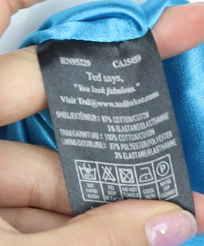 Elevate your wardrobe with this stunning Ted Baker Women's A-Line Dress that combines elegance and charm. Designed in a captivating blue hue, this knee-length dress is perfect for spring and summer occasions. Made of a cotton-elastane blend, it ensures comfort while maintaining a sleek silhouette. The dress features a playful ruffle accent and a flattering round neckline, making it ideal for parties and cocktail events. Its strappy sleeves add a touch of sophistication, and the dress is fully lined for added luxury. Pair it with your favourite heels and statement jewellery for a chic ensemble that will turn heads. Excellent condition with slight natural wrinkles, offering style at an attractive price.