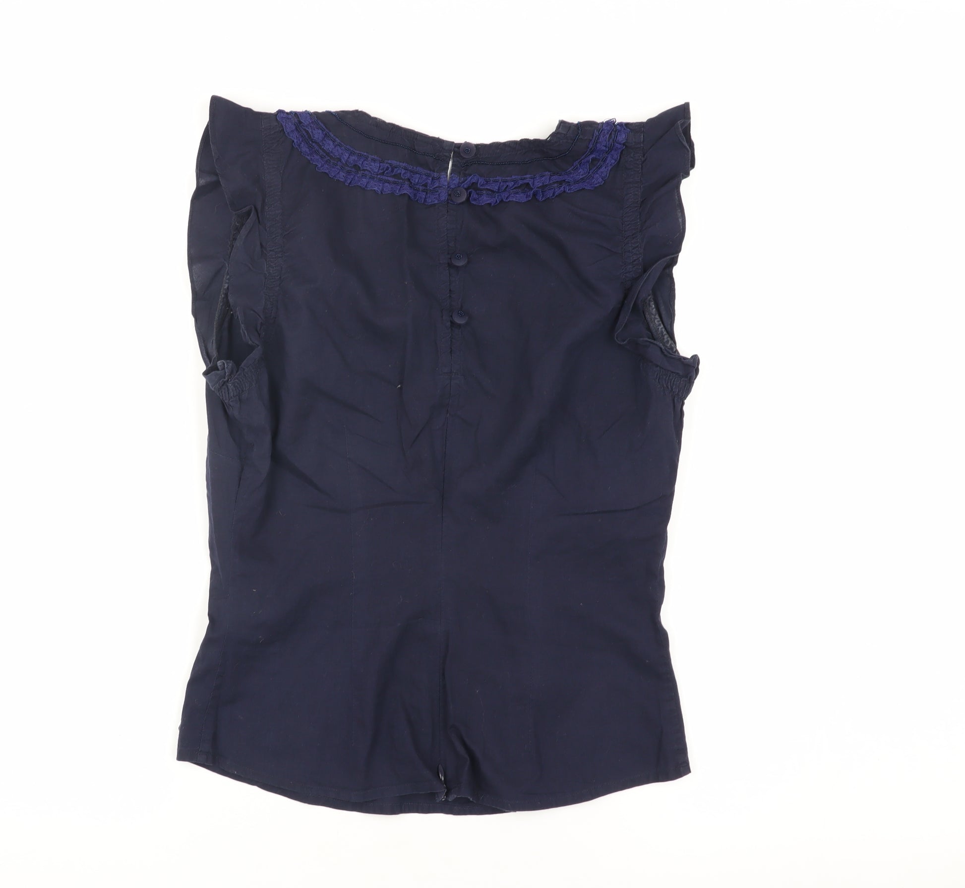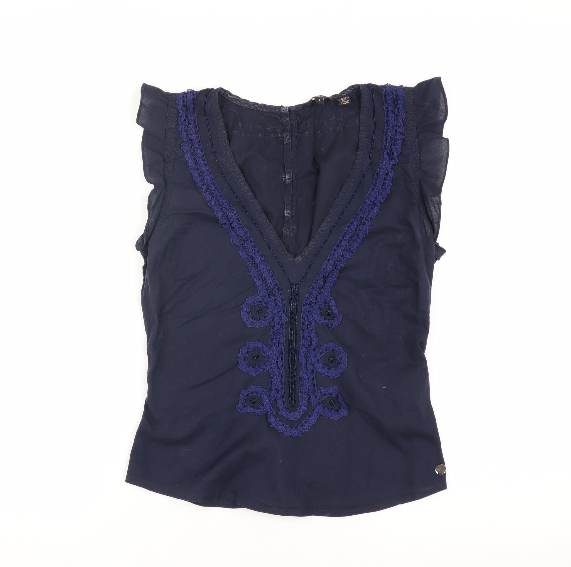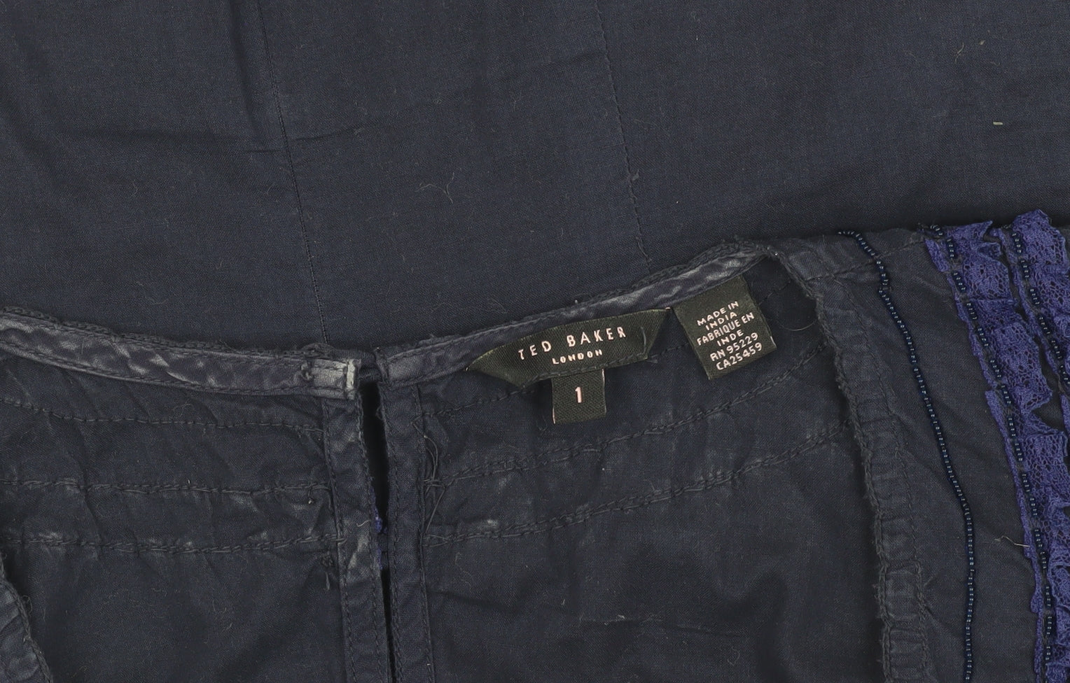 Elevate your wardrobe with this sophisticated Ted Baker blouse. Designed for women, this exquisite blue camisole features intricate embroidery that adds a chic touch to your look. Crafted from 100% cotton, it provides a comfortable and breathable fit, perfect for spring and summer outings. The V-neckline and sleeveless design enhance its casual appeal, while the backless detail offers a modern twist. The blouse falls under the regular size type with an XS size, making it a great fit for petite figures. Its woven fabric type ensures durability and elegance, suitable for various casual occasions. This blouse is in very good condition, displaying slight wear but no major stains, ready to bring charm to your ensemble. With a button closure for ease of wear, this solid-patterned piece promises to be a versatile addition to your wardrobe. Whether paired with jeans for a laid-back day out or dressed up with a skirt for a casual meet-up, this Ted Baker blouse is a must-have. Invest in timeless style and comfort today.