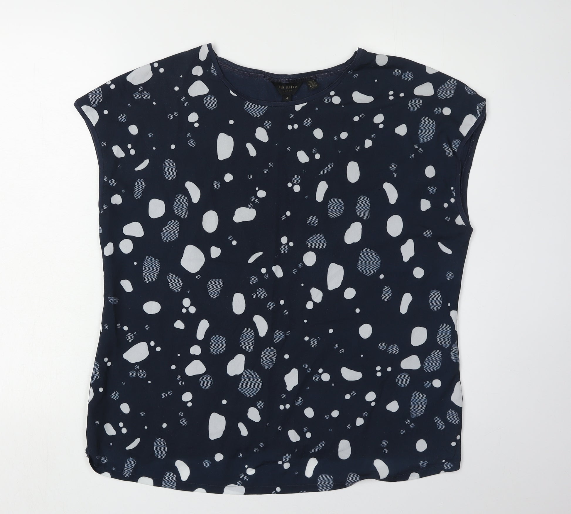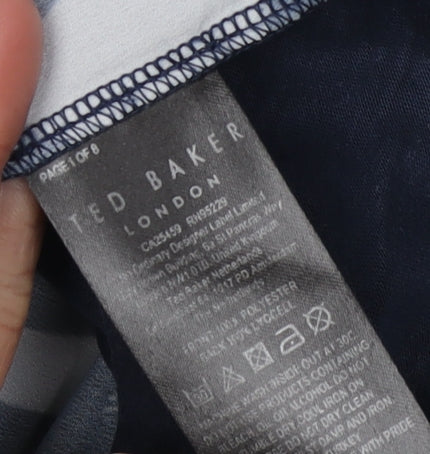 This Ted Baker women's blouse offers a modern twist with its captivating geometric pattern in a sophisticated shade of blue. Ideal for casual occasions, this sleeveless blouse is crafted for comfort and style, featuring a crew neck design that pairs effortlessly with its regular fit silhouette. Made from 100% polyester, it ensures durability while maintaining a lightweight feel, perfect for all-day wear. Despite no original sales tags, it remains in excellent condition with minimal signs of wear, making it a must-have addition to your wardrobe. Elevate your everyday look with this versatile piece, blending effortlessly into both day and evening outfits.