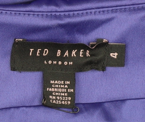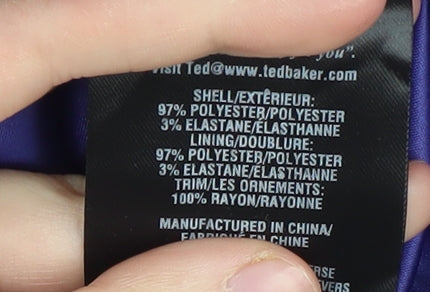 Elevate your wardrobe with this stylish Ted Baker women's pencil skirt, perfect for formal occasions or a chic night out. The radiant purple hue stands out, adding a pop of colour to your ensemble. Crafted with a blend of polyester and elastane, this skirt offers a comfortable fit with a slight stretch for ease in movement. The sleek straight and pencil style ensures a flattering silhouette, while the convenient zip accentuates its modern design. This skirt is ideal for women seeking a regular size fit and boasts a sophisticated appeal suitable for all seasons. Despite minor wear at the seams, it remains in very good condition, ready to become a staple in your fashion collection. Whether paired with a blouse for the office or a stylish top for an evening event, this Ted Baker skirt is sure to impress.