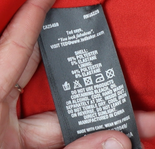 This stunning Ted Baker sheath dress is crafted for the modern woman who values elegance and style. In a striking shade of red, this knee-length dress is perfect for autumn and spring occasions like weddings, parties, or formal events. It's tailored with a regular fit in size 10, featuring a flattering sleeveless design and a captivating embellished neckline that adds just the right amount of sparkle to any ensemble. Constructed from a premium woven fabric blend of 95% polyester and 5% elastane, the dress offers a perfect balance of comfort and style. The lightweight material is fully lined and ensures a smooth silhouette, while the back zip closure provides ease of wear. Its classic sheath style is complemented by chic cap sleeves and beaded accents, making it an excellent choice for cocktail parties and other elegant gatherings. This dazzling red dress is in excellent condition, appearing almost brand new with no visible signs of wear. It's easy to care for with simple hand wash instructions, which make maintenance a breeze. A true embodiment of Ted Baker's sophisticated charm, this dress is an essential addition to any fashionable wardrobe. Get ready to turn heads and make a memorable statement at your next event.