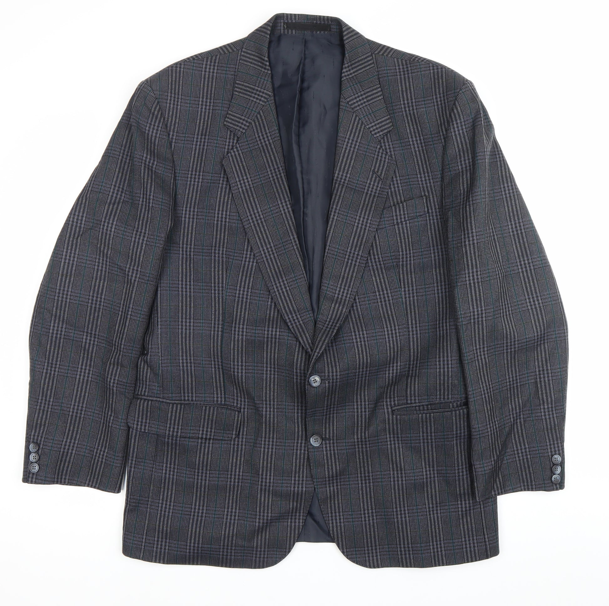 Elevate your wardrobe with this sophisticated men's blazer from The British Tailor, a brand renowned for quality tailoring made in Great Britain. Crafted from 100% pure new wool, this jacket offers a luxurious finish and structured yet comfortable fit. Designed in a timeless grey check pattern, it exudes classic elegance while being versatile enough to complement both formal and semi-formal occasions. The single-breasted two-button closure ensures a smart silhouette, while the notched lapels add a traditional touch. With a double-vented back, this blazer provides ease of movement and a refined appearance from every angle. The interior is finished with practical inner pockets, enhancing both style and functionality. Cut in a regular fit and sized as a UK 44 chest (equivalent to Euro 54 Regular), it provides a balanced and flattering fit for the modern gentleman. This blazer is ideal for business meetings, evening functions, or wedding attire, making it a highly versatile addition to your wardrobe. Best styled with tailored trousers for a formal finish, it also works well with dark denim for a more refined smart-casual look. Suitable for autumn and winter wear thanks to its breathable but warm wool composition, this piece promises both durability and comfort. Condition is excellent with no visible flaws, making it a smart investment. A quality garment designed for those who appreciate the craft of traditional British tailoring and understated sophistication.