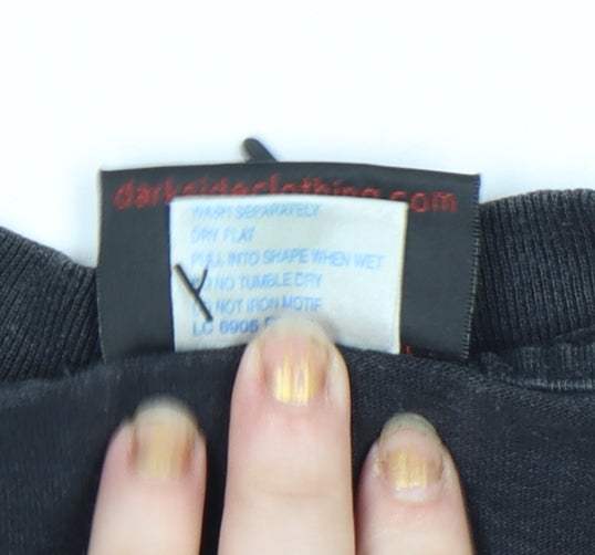 Step into the darkly stylish world of alternative fashion with this authentic The Darkside men's black T-shirt. Crafted from 100% soft cotton jersey, this piece offers a breathable and comfortable fit perfect for daily wear or casual nights out. The shirt features a striking gothic graphic motif subtly imprinted on the front, reflecting The Darkside’s signature edgy aesthetic with a bold, mysterious vibe. Designed with a classic crew neck and short sleeves, it ensures timeless appeal while maintaining a relaxed, regular fit ideal for layering or standalone styling.The high-quality black cotton material provides durability and comfort, holding its shape wash after wash. Machine washable for simple care, it’s a practical choice for anyone who loves expressive garments with an alternative edge. Styled with care instructions printed internally, you can rest easy knowing this T-shirt is made for longevity and ease of maintenance. The subtle distressed and worn-in texture adds character without compromising quality, giving the piece a naturally cool, lived-in look.Perfectly suited for fans of gothic, rock, or alternative themes, this T-shirt brings together comfort and attitude in one versatile piece. Whether paired with dark denim jeans and boots for a night out or worn casually with shorts during summer days, it effortlessly enhances your wardrobe with unique flair. Representing The Darkside brand’s cult appeal and gothic artistry, it’s a must-have addition for those who appreciate unconventional style. Embrace individuality and comfort with this distinctive The Darkside men's black cotton graphic T-shirt — a timeless staple for all seasons that balances dark style with wearable comfort.